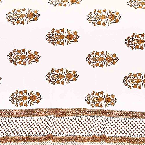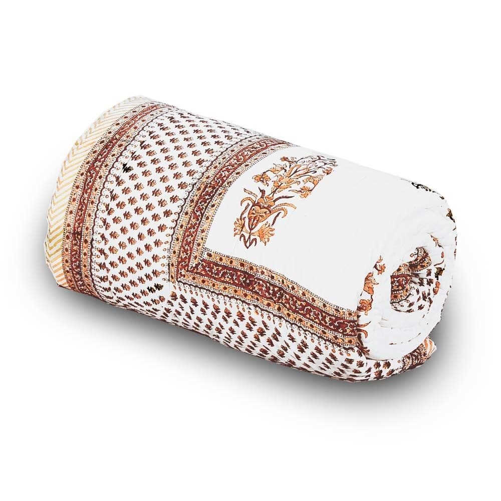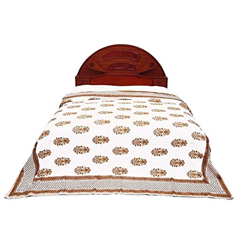 This light weight yet very warm Jaipuri Cotton AC Comforter from Little India features a beautiful botanical inspired floral pattern that comes to life in soothing hues of brown on white base. This original design is made from famous sanganeri handblock floral motif prints and bordered with stylish zig-zag pattern that adds style to it. World famous Jaipuri Pure Cotton Double Bed Comforter (also populary called as Dohar) in traditional Sanganeri Hand Block Print of Rajasthan. The Comforter is a 3-layered cover with middle layer of high grade flannel sheet between two layers of cotton fabric. Being light weight these are ideal during travelling. Jaipuri comforters are characterized by their incredible feather-weight lightness softness and warmth. These beautiful Dohars are a specialty of Jaipur.