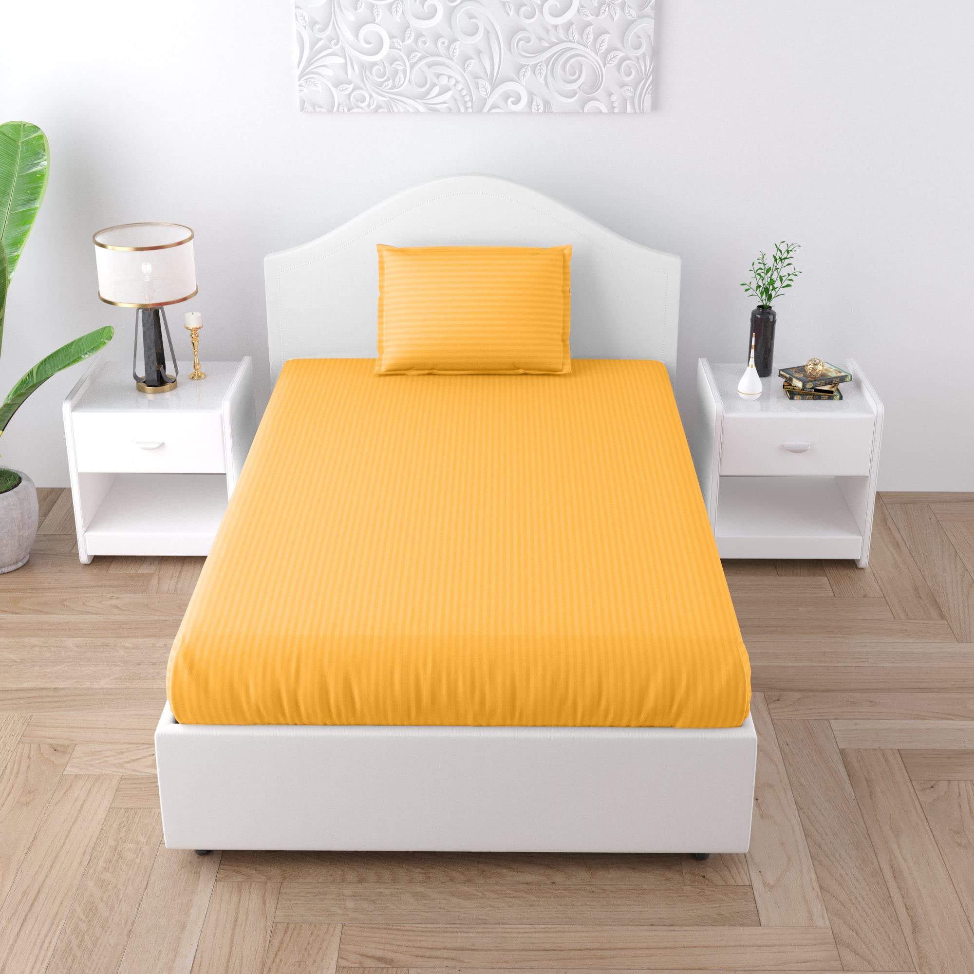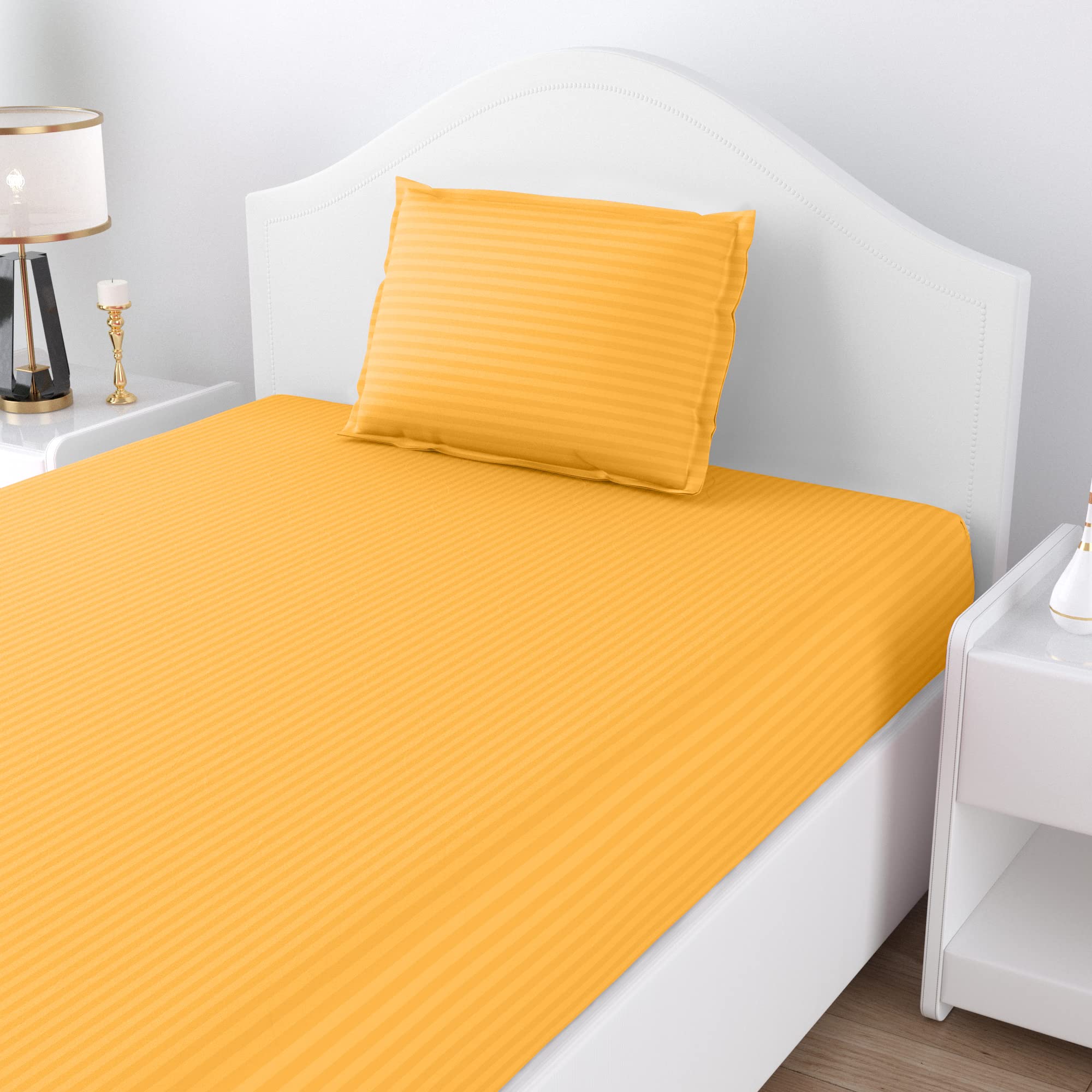 RAJASTHANI PUPPETS Mango Yellow Satin Stripes Single BedSheet with Pillow Cover