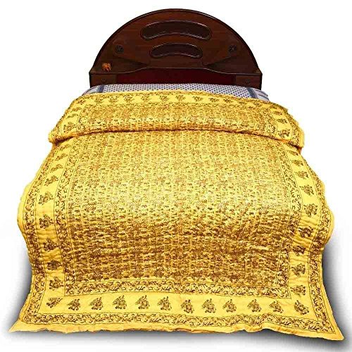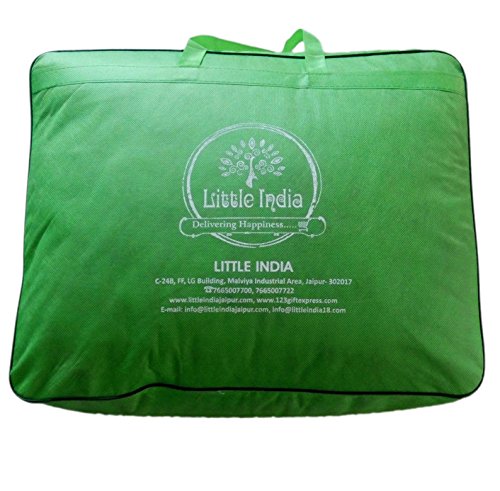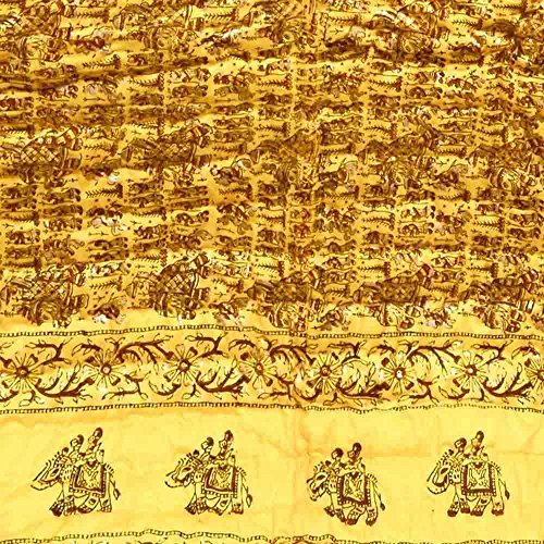 A royal print comprising of the king riding atop his richly caparisoned elephant accompanied with his rich army on horses rendered on creamy yellow base with brick red and gold print will be a jewel in your bedroom. This exclusive Jaipuri AC Comforter comes with traditional handblock golden floral print on the border that compliments well with this Little India handmade comforter designed to chase away winter blues and chills. World famous Jaipuri Pure Cotton Double Bed Comforter (also populary called as Dohar) in traditional Sanganeri Hand Block Print of Rajasthan. The Comforter is a 3-layered cover with middle layer of high grade flannel sheet between two layers of cotton fabric. Being light weight these are ideal during travelling. Jaipuri comforters are characterized by their incredible feather-weight lightness softness and warmth. These beautiful Dohars are a specialty of Jaipur.