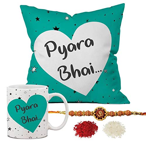 Christmas Vibes Pyara Bhai Rakhi Gift Hamper Combo - 4pc (1 Cushion 1 Mug 1 Om Rakhi and Roli Chawal) Rakhi Gift for Brother Rakshabandhan Gift Rakhi Gift for Bhai