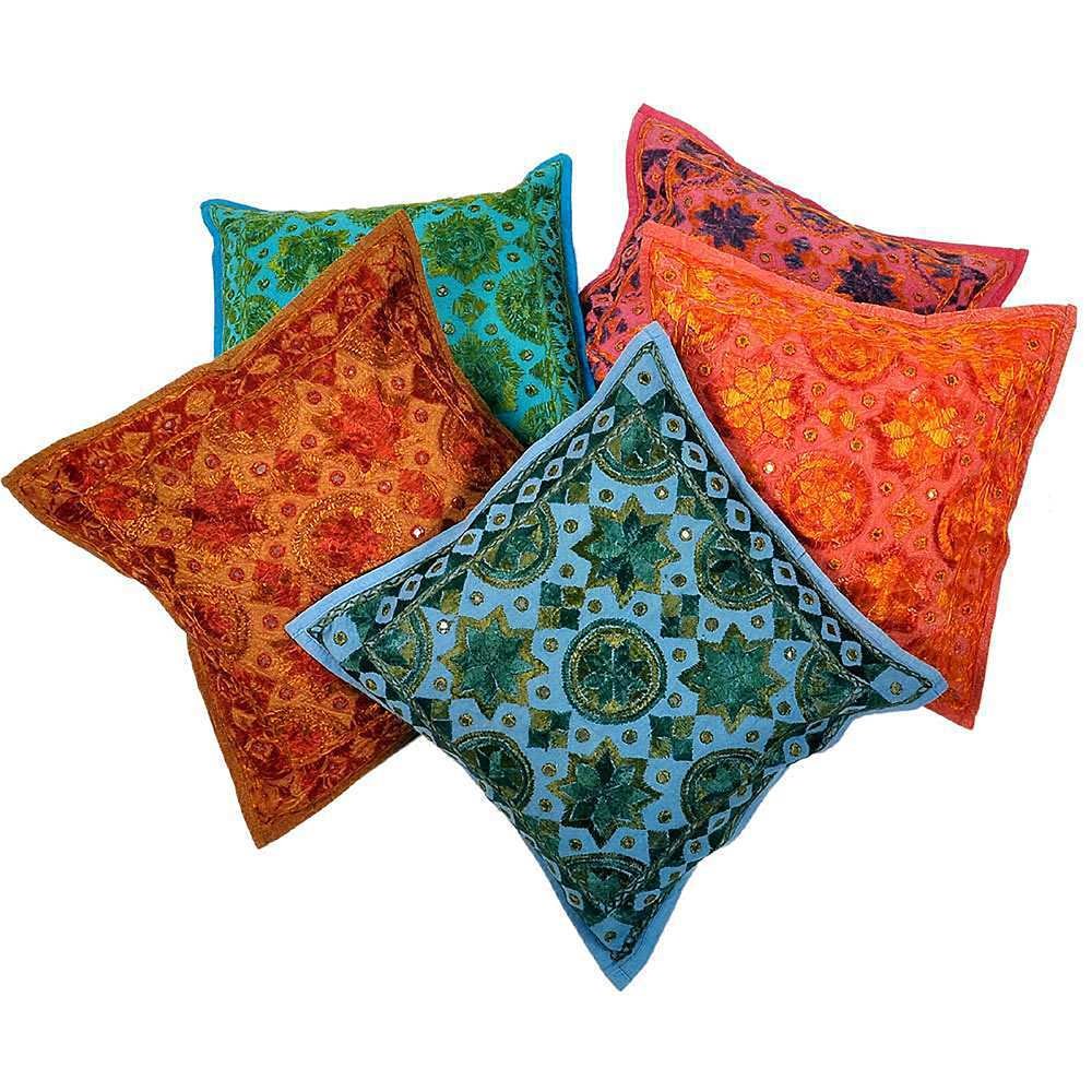 This multicolour 5 piece cushion cover set is graced with hand embroidery and mirror work. Aesthetically designed cushion cover will match the ambience of your house. Each cover is adorned with matching work to make it worth buying. The beautiful little mirrors with matching threads transform the cushion cover into masterpiece. The cushion covers are finished with broad cotton matching piping. These handmade cushion covers showcase the craftsmanship of Rajasthan.