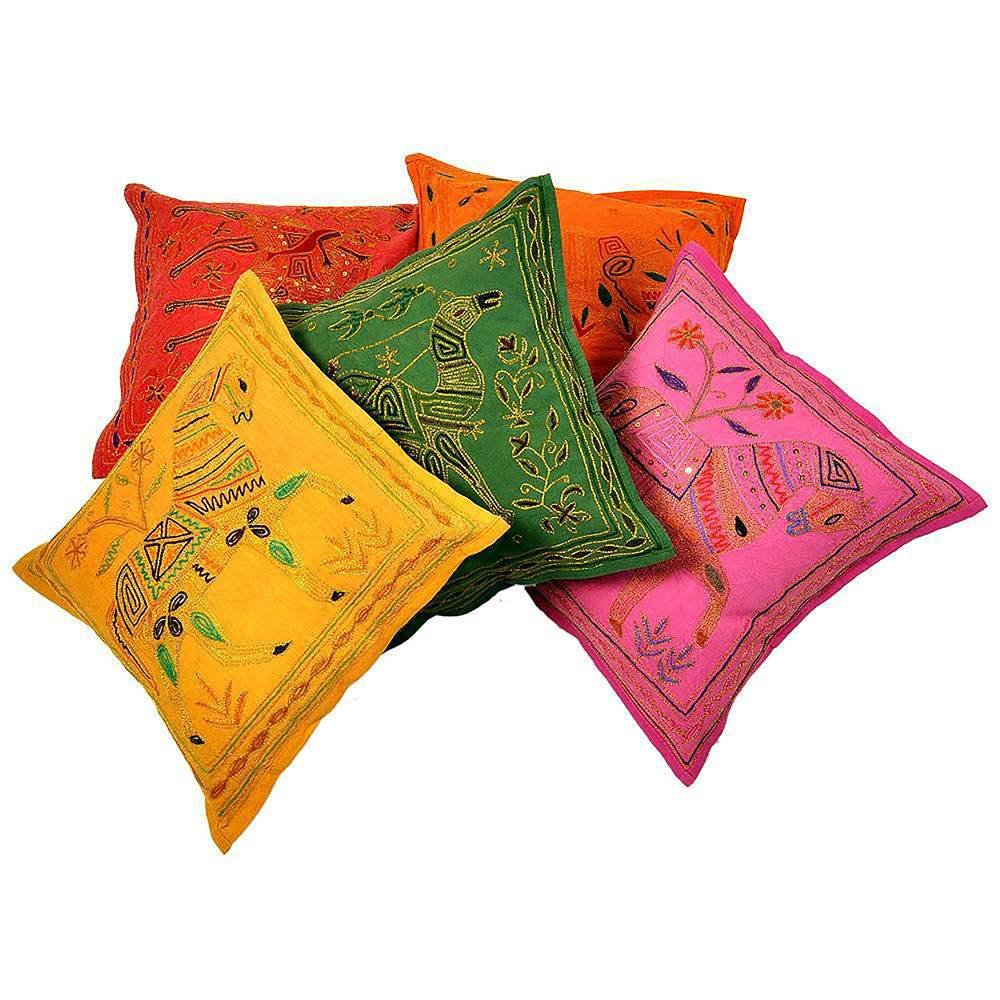 Add this set of 5 piece cushion cover set to your home decor and give it a warm traditional touch. Made from cotton and are graced with hand embroidery. The camel pattern made with zari embroidery spell elegance and class. The product is an amazing ethnic masterpiece. They are prepared by master artisans of Rajasthan.