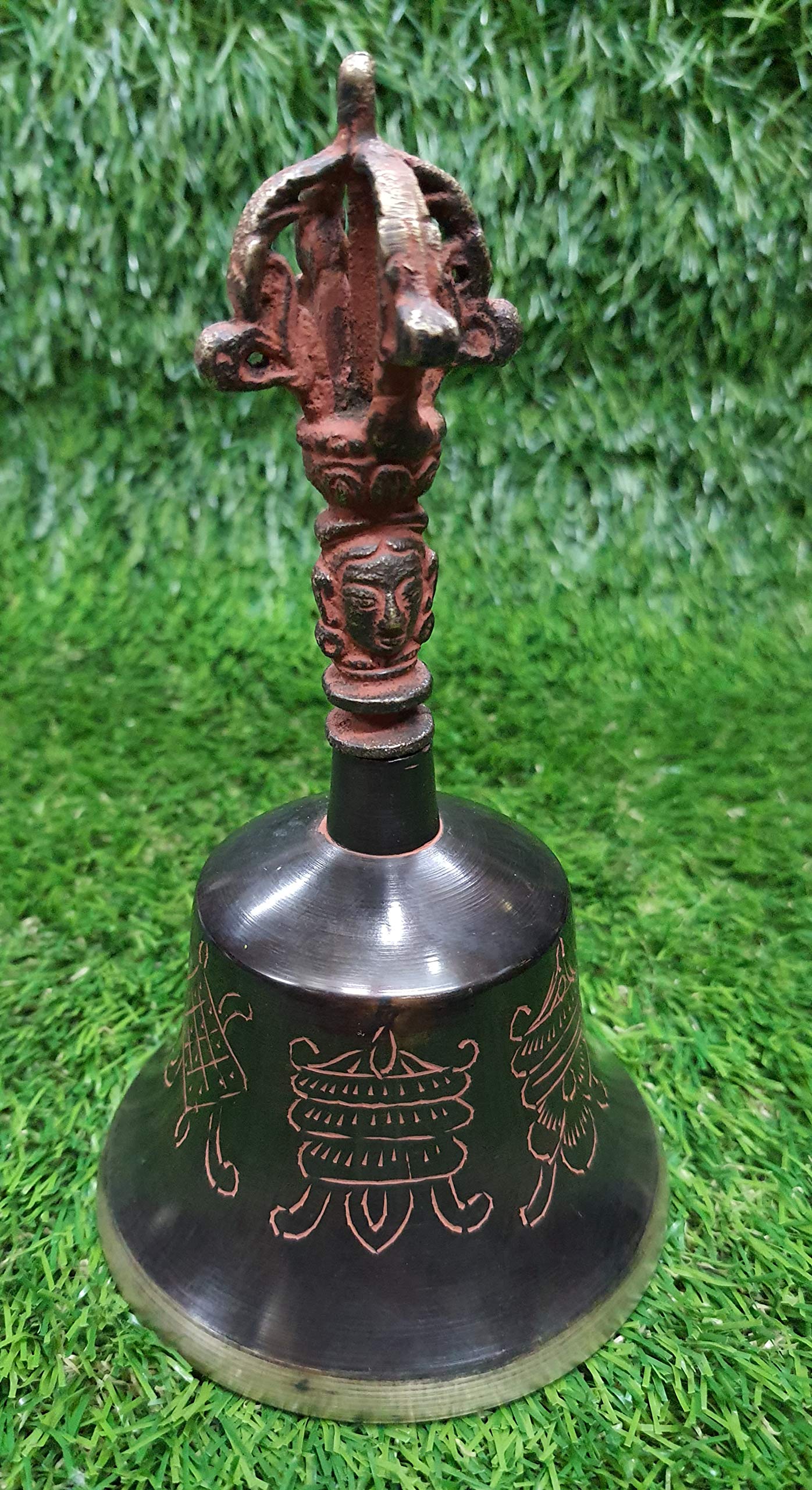 Bronze metal tibetan buddhist style antique finish 8 auspicious sign highlighted on it with brass handle in 7" height for poojameditation and decorative bell very well and fine handcrafted product