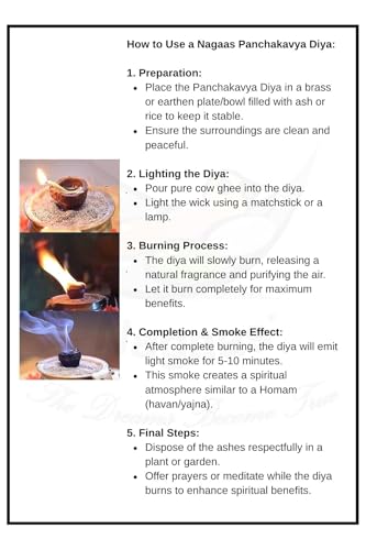 Nagaas Panchakavya Deepam 60 Diyas in box A perfect way to fill your living space with positive energy. our Panchakavya Deepam is 100% made pure of cow dung gomiya ghee curd & milk. with these 5 basic ingredients. Use pure ghee to light this Deepam & use pure cotton white batti. lighting this Deepam during sunrise & sunset brings all goodness into your living space. but its perfectly okay to light this anytime in the morning & evening. The benefits are phenomenal. they are to be experienced. light the deepam for 21 days continuously to see the way our body mind & soul is evolving. itll bring in the abundance of health happiness peace & prosperity. These deepam are eco-friendly and doesnt leave behind any carbon footprint. this was very important for me to not increase carbon inhaling in the name of rituals. Do's and Don'ts | Please read these instructions:- Lighting panchakavya deepam is like doing mini Homam or yagna. so do not light this deepam in the pooja room or pooja cabinet. lighting this in the center of the home is ideal so that the positive fumes fill the home. and its also for safety purposes since the entire deepam will burn. also ensure safety when babies or young kids are around. Do not light this in pooja cabinets to avoid the wooden cabinets catching fire. ensure to light this deepam where theres enough space around. request to choose a place where itll be ideal to do a mini Homam / yagna. Use copper/brass plates to place the Deepam. and avoid touching it immediately after the deepam is burnt fully. the ashes will also be very hot. good quality ghee will ensure Diya burns completely. Be careful precautions for safety if anyone has any kind of allergy to fumes. ensure take care that in the initiative of bringing good vibes it shouldnt trouble anyone.