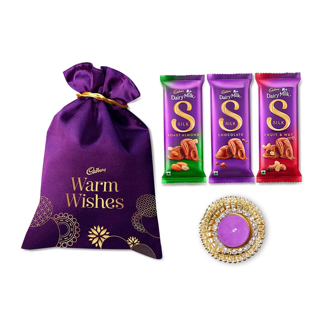 Kuch achha ho jaaye kuch meetha ho jaaye with Cadbury Celebrations. Filled with the goodness of Cadbury chocolates the perfect gift for those whose presence makes every occasion perfect. Made with love a chocolate Potli meant for every occasion- a Rakhi gift for your brother or sister a special one's Birthday Diwali with family create moments to cherish with Cadbury. This assorted chocolates gift pack contains different flavours Cadbury Dairy Milk Silk. Get any 3 Cadbury silk chocolates from the following options - Silk Bubbly 50 g Silk Fruit & Nut 55 g Silk Oreo 60 g Silk Mousse 50 g and Silk Plain 64 g and a Diya. Perfect for gifting your loved ones on every occasion. Just like every bar of Cadbury Dairy Milk this is suitable for vegetarians