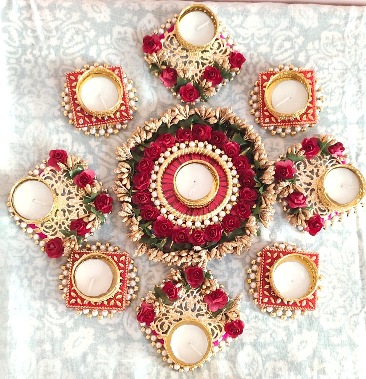 Dynore Set of 9 Rangoli with Diya Set - Artificial Flower Red Rose and Pearls Rangoli with Tealight Festive Decor