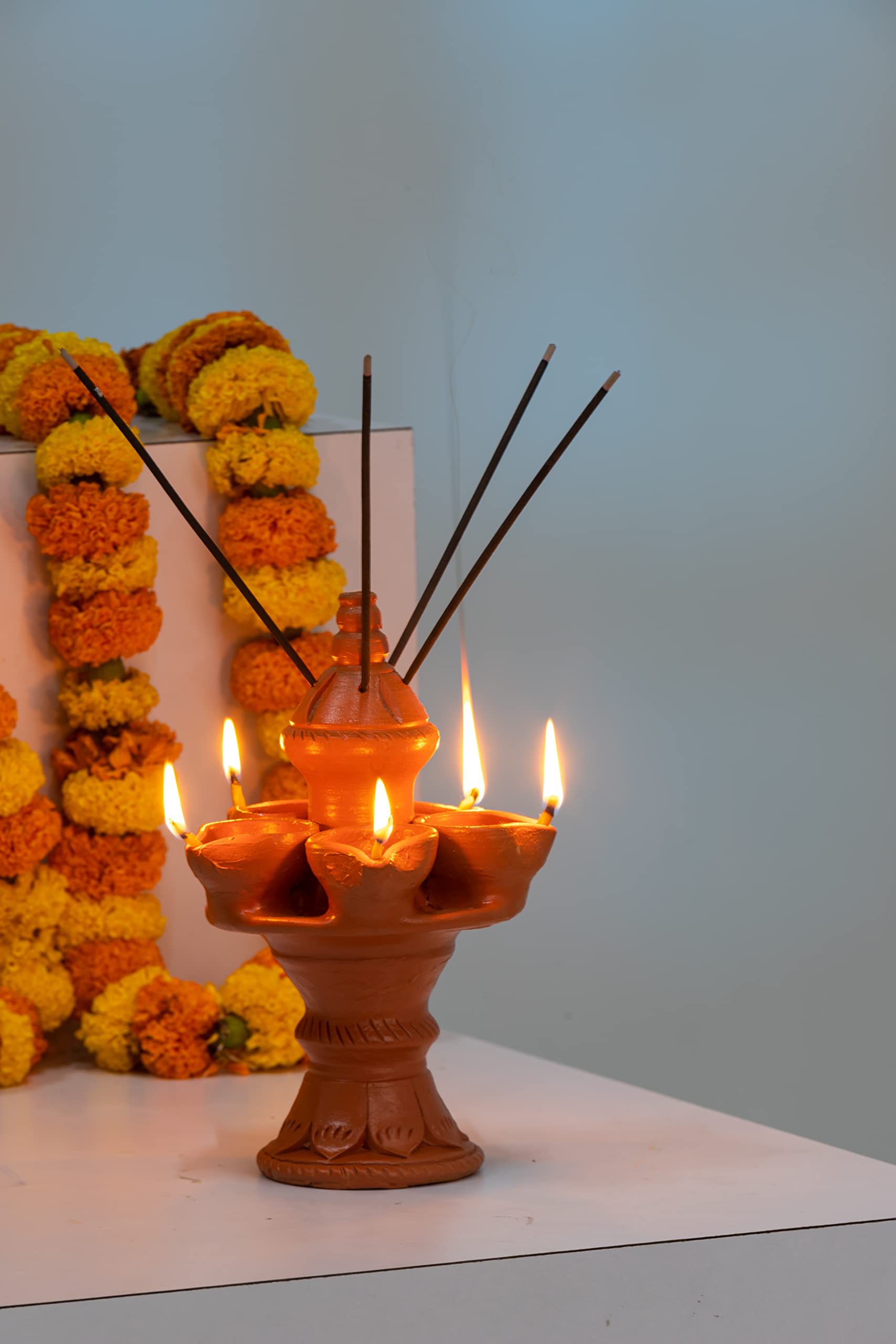 Haus Fabula Wheel Thrown Terracotta Stand Panch Diya with Incense Stick Holder for Pooja Decor, Navaratri Decor, Diwali Lighting, Diwali Gifting, Home Decor