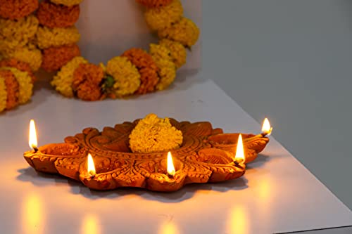 This diya will enhance your home decor and holiday festivities. Traditional handmade earthen clay diyas add a splash of colour to your home. Use them instead of decorative lights to brighten your home during the festival. Made of clay natural colours no artificial colours added 100% eco-friendly 100% environmentally friendly. A one-of-a-kind terracotta diya for your puja room. Handmade item with a unique design. A fantastic option for everyday use at home.