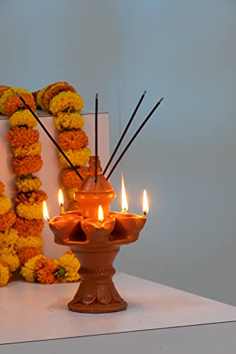 Karru Krafft Wheel Thrown Terracotta Stand Panch Diya with Incense Stick Holder for Pooja Decor, Navaratri Decor, Diwali Lighting, Diwali Gifting, Home Decor