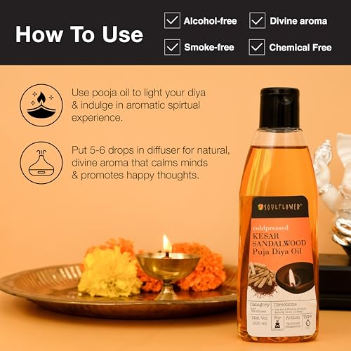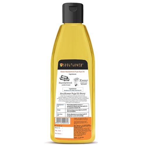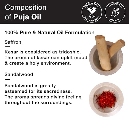 PREMIUM GRADE INGREDIENTS DIRECT FROM FARM TO SHOPPING LIST:â¯Soulflower Kesar Chandan Pooja Oil is safe and secure aromatizer for your personal space.â¯It is free of chemicals synthetic colors or fragrances.â¯Kesar Chandan Pooja Oil is a 100% pure and