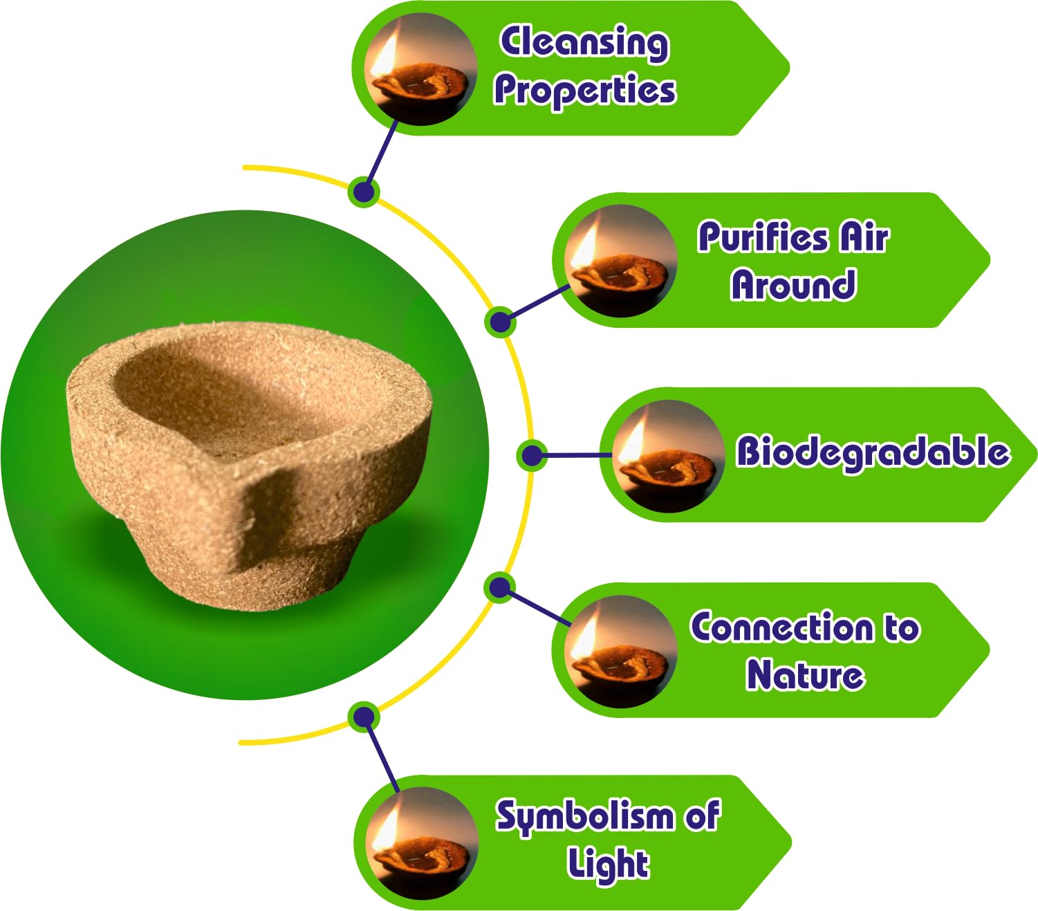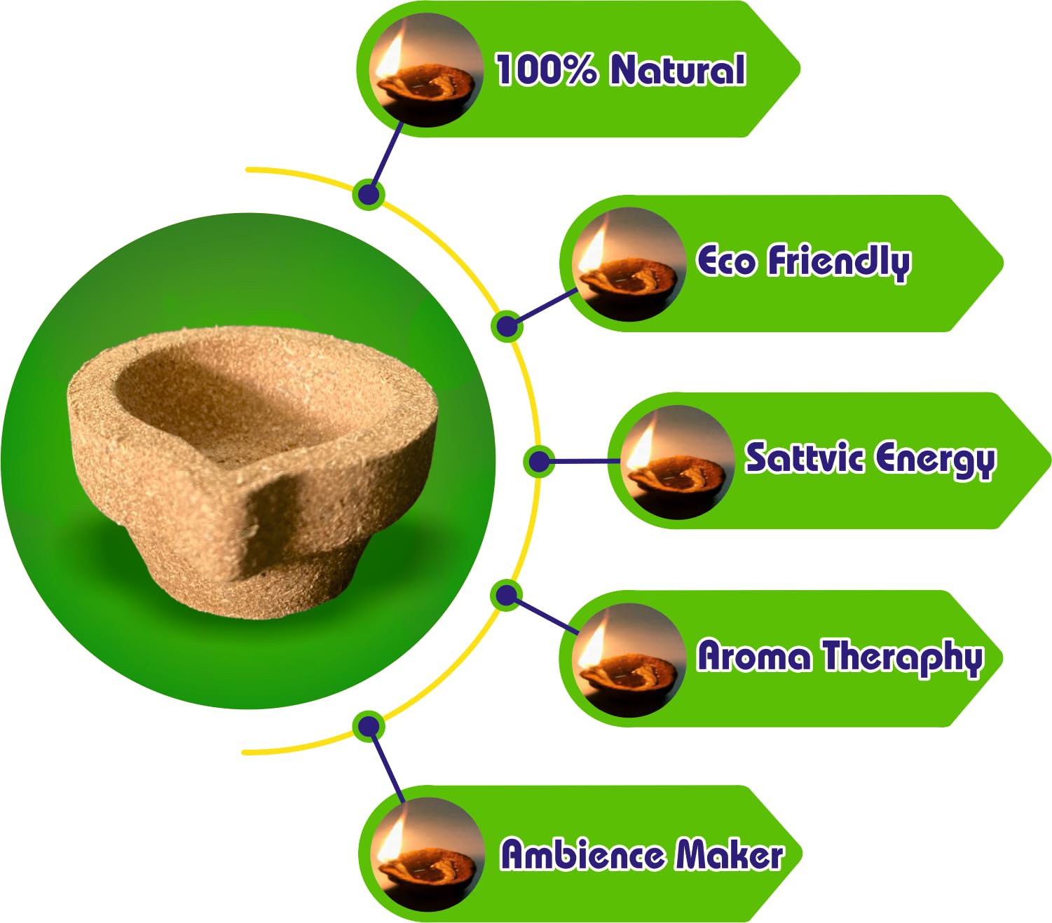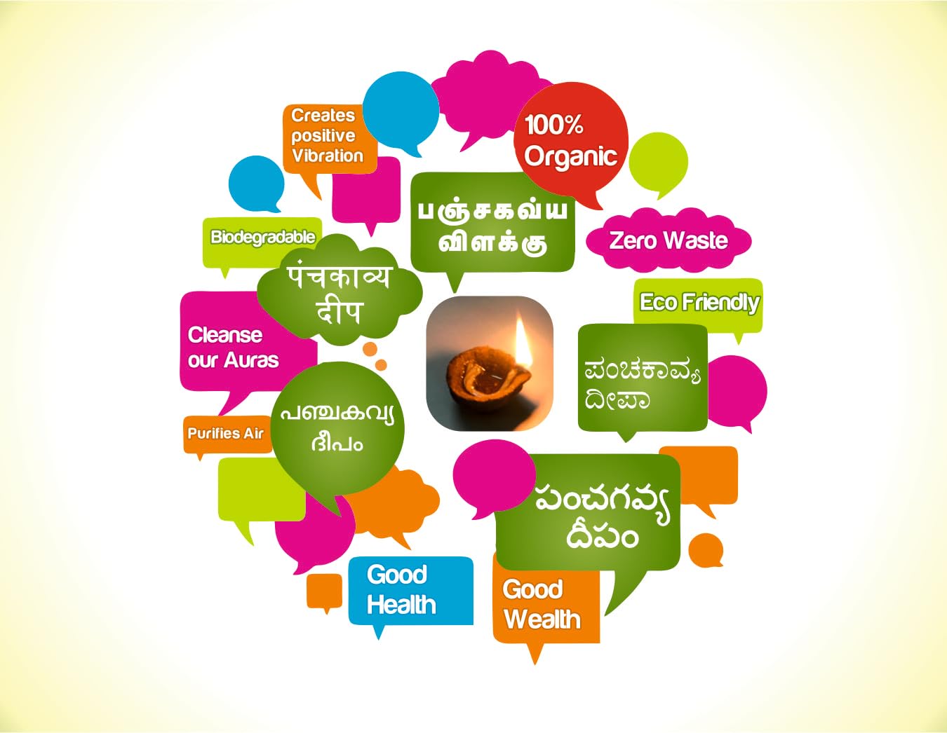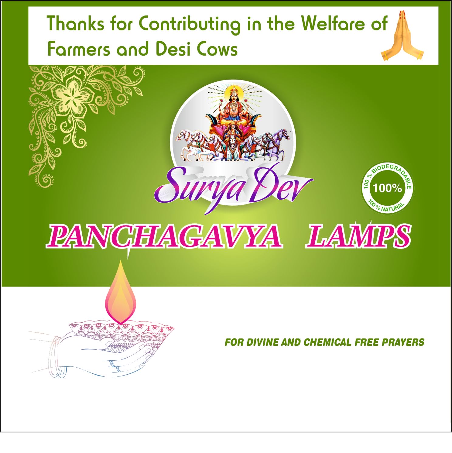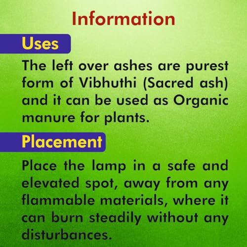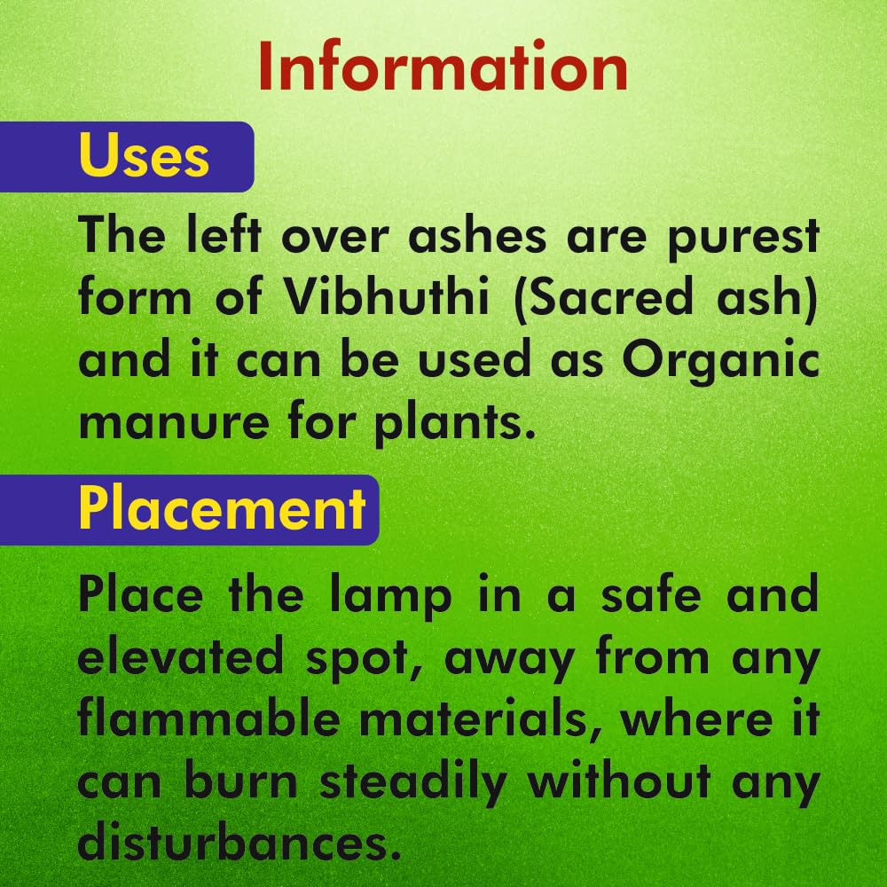 Our Panchagavya Vilakku / Deepam / Diya is made up of Desi cow dung gowmuthra milk curd and ghee. Panchagavya Vilakku / Deepam / Diya can be used only once because after burning the lamp itself is rendered ashes. Our Panchagavya Vilakku / Deepam / Diya made up of Desi cow dung leaves no carbon while burns out. Use it for your daily prayers to get all wealth and prosperity Spiritually all the Divine Forces are brought together to the very spot where the Panchagavya Vilakku light burns and we are auspiciously blessed manifold. The left-over ashes can be used as organic manure for plants and for improving the soil fertility as well. Preferred Days and Time: ð¥ Best time is to light up in the Morning 4AM to 6AM - Brahma Muhurta or evening 6PM to 7PM. ð¥ Light up 48 days continuously to get benefits of Yagam/Homam Palan. ð¥ Every Tuesday Friday Ammavasai Pournami and other special occasions as you wish. Directions to use Use a plate or dhoopakaal as the shell also burns out. Pour ghee and leave it for 10 minutes then light up. Use ghee and cotton wick