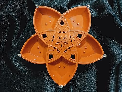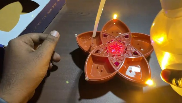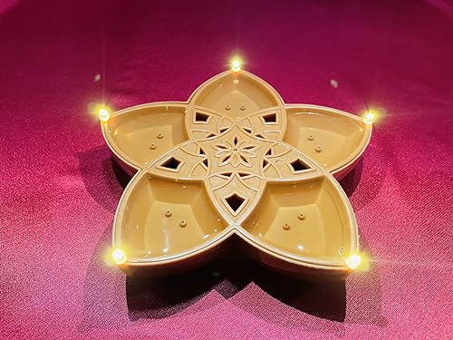• This unique product features five 5 warm yellow ambiance LED lights positioned in petal-like arrangement each facing a different direction creating a beautiful flower like design. At the center of the Diya there's a multi-color LED light embedded within t