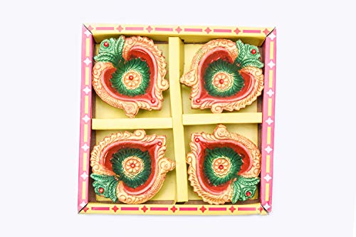 • Decorated with acrylic gemstones and hand painted with rich and smooth colors adds an elegant look to the Peacock design engraved on the Earthen Diya. As you light-up these diyas all together in combinations or individually it gives an awesome array of li