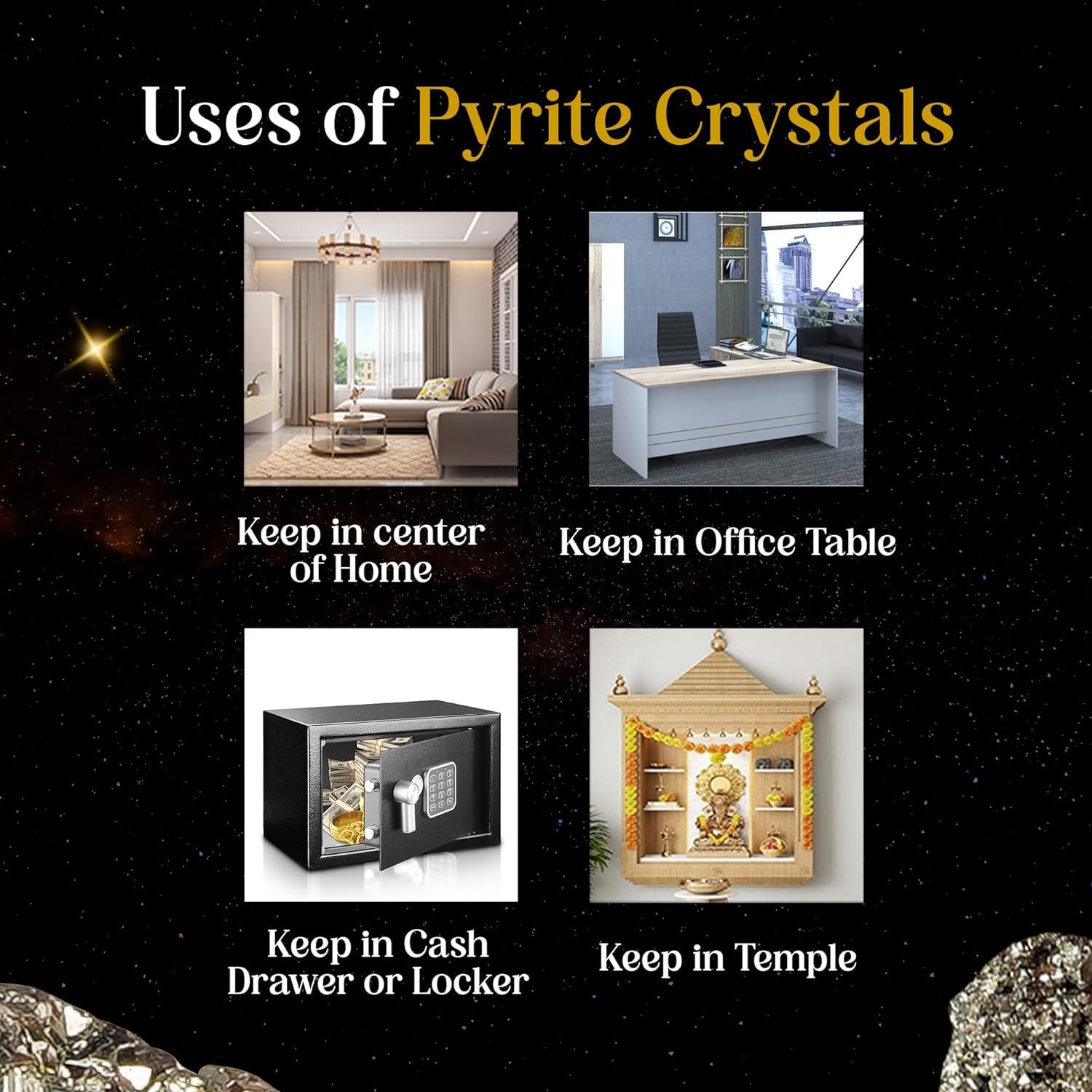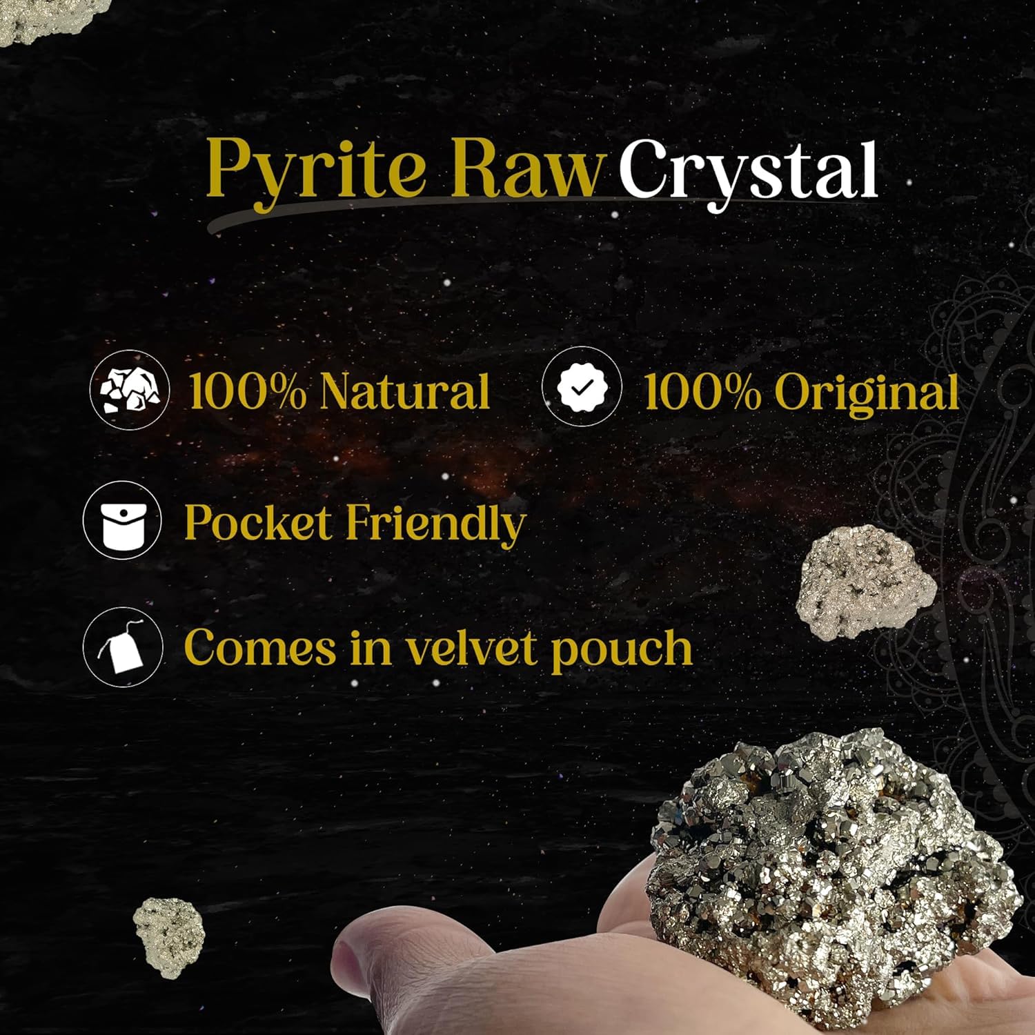 Sukhad - Pyrite raw crystal stones have a rough surface with a shiny appearance. Pyrite can attract money good luck abundance and confidence. They are also known as money-magnet crystals due to their money-attracting nature. These raw crystals can also boost creativity and make the user feel positive. Pyrite Crystals can be used by anyone to attract money and wealth fast. People also use pyrite raw crystals for home decoration making jewellery or in spiritual practices. Pyrite are easy to carry as they are pocket-friendly. You can keep them in your money drawer or your wallet as well. Pyrite raw crystals are considered a symbol of wealth and prosperity because they are attractive. These crystals have protective qualities helping to shield the user from negative energy and harm. Some people carry pyrite raw crystal stones as a protective charm or keep them in their living spaces for this purpose.