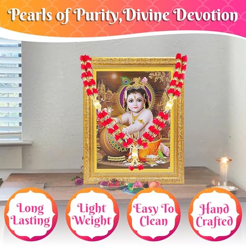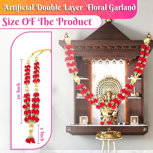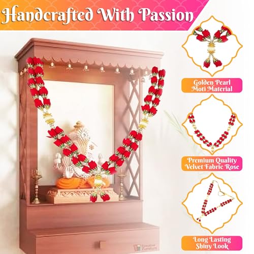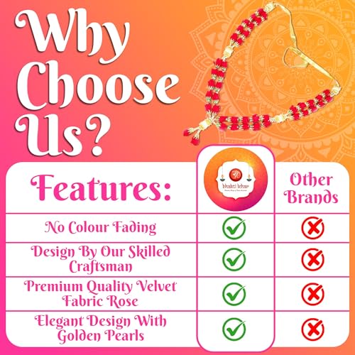 Bhakti Lehar 22 Inch Large Size Velvet Red Rose Artificial Garland Gulab Mala is made up of Fine Quality Velvet Rose Material and White Pearl Moti Material. The design of this mala is totally hand-made which is specially designed by our skilled craftsmen. This Photo Frame Garland Mala can be used for God Idols Photo Frames Murti Bhagwan Drama Costumes Photo Frames & Photo of Your Loved Ones. This handmade mala is easy to clean just wipe it gently with a clean dry cloth for a long lasting shining lookProduct SpecificationsMaterial: Velvet Rose & Artificial Moti Length: 24 InchesThickness: 2 InchColour: Red