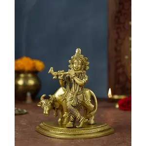 Brass Krishna with Cow Idol Murti -...