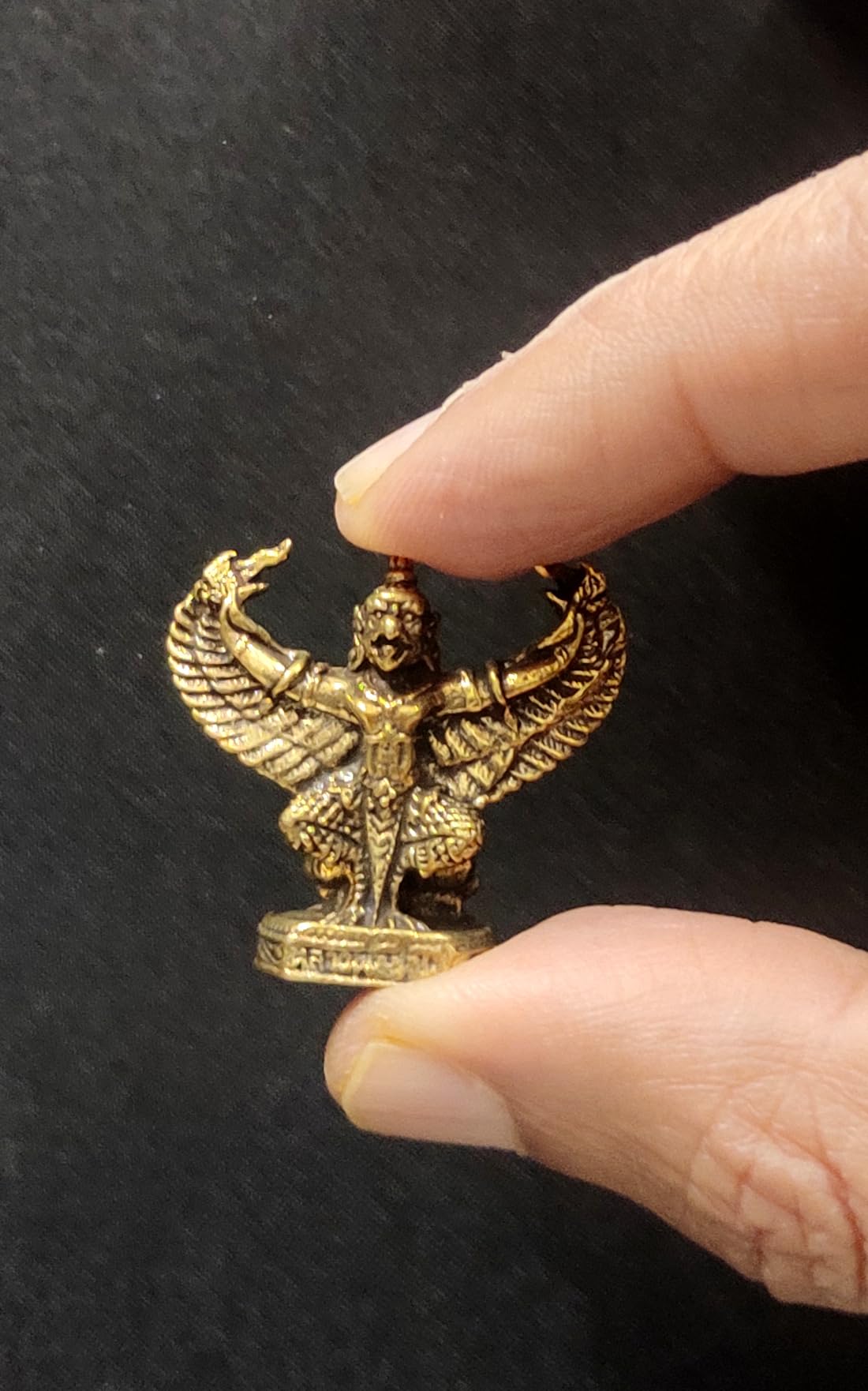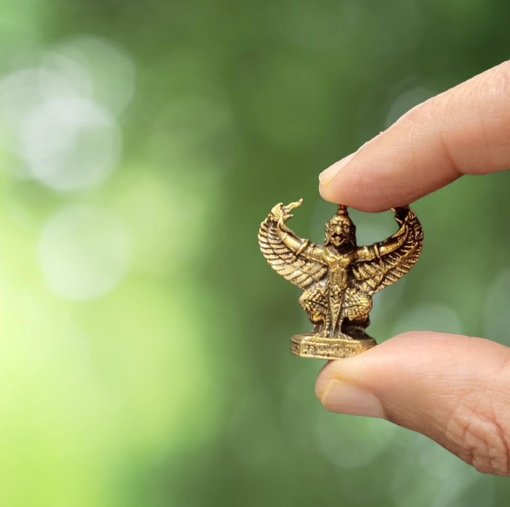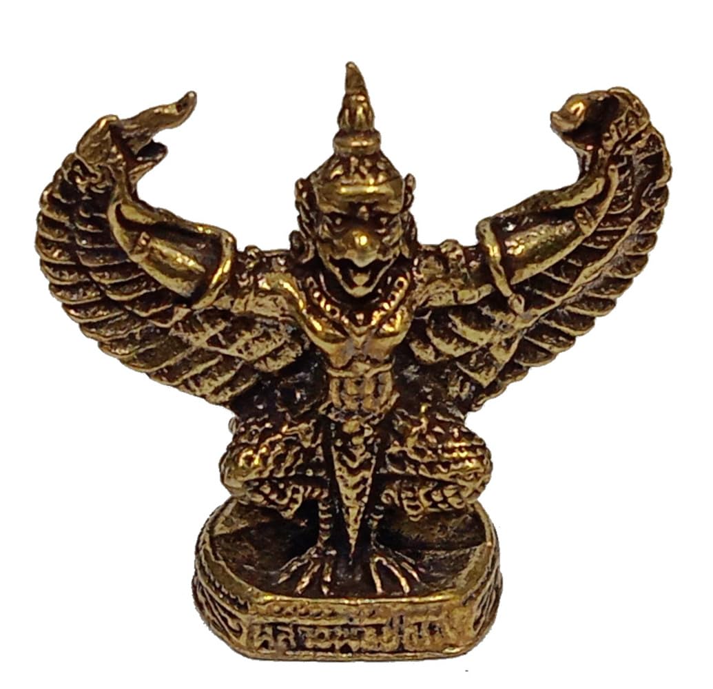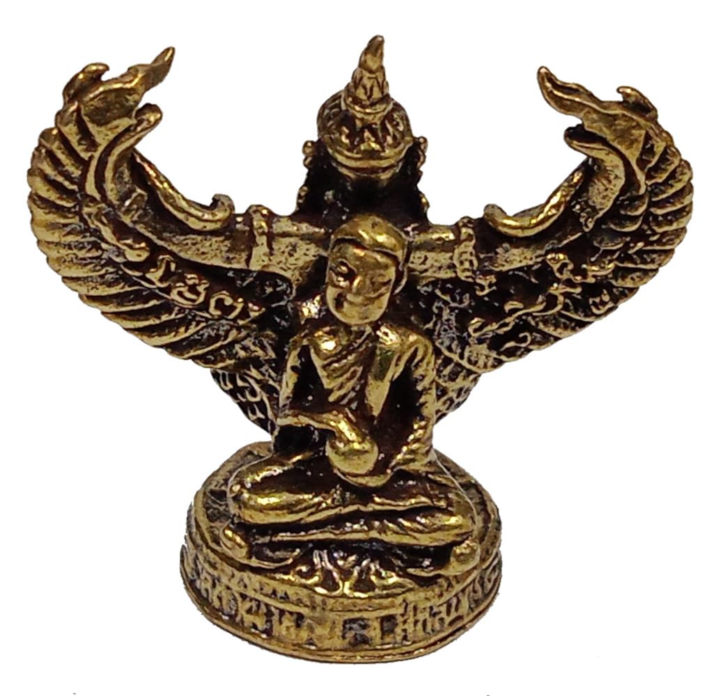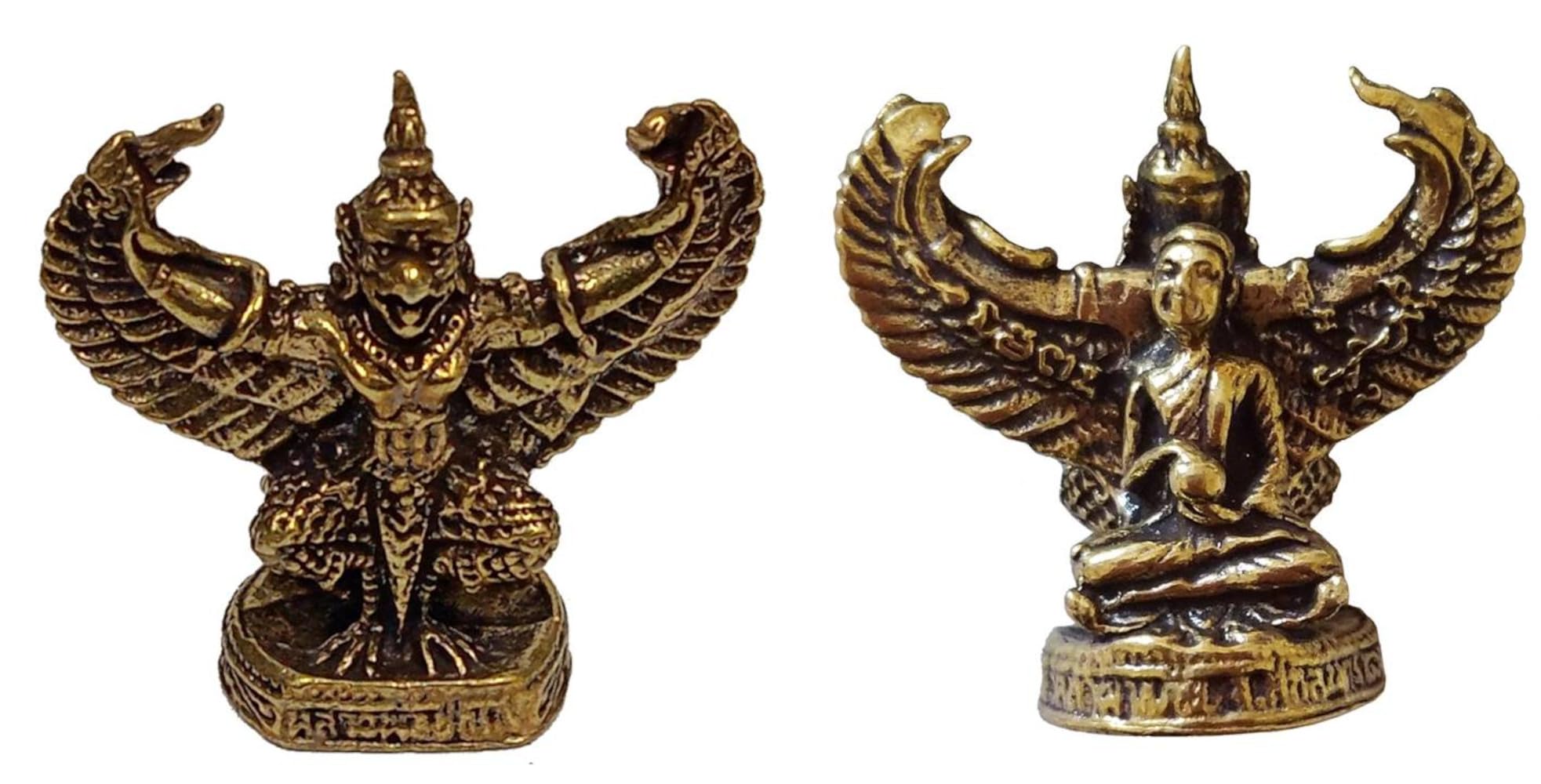 Phra Upakut from Thai Buddhist mythology is a benevolent deity who protects against all evils and physical harm and is an auspicious attractor of wealth. The Garuda is a mythological beast of the Hindu and Buddhist tradition. According to Hindu mythology the Garuda is the vahana (vehicle) of the god Vishnu (Narayana). Miniature idols may have minor polishing or casting blemishes that can't be avoided at this size.