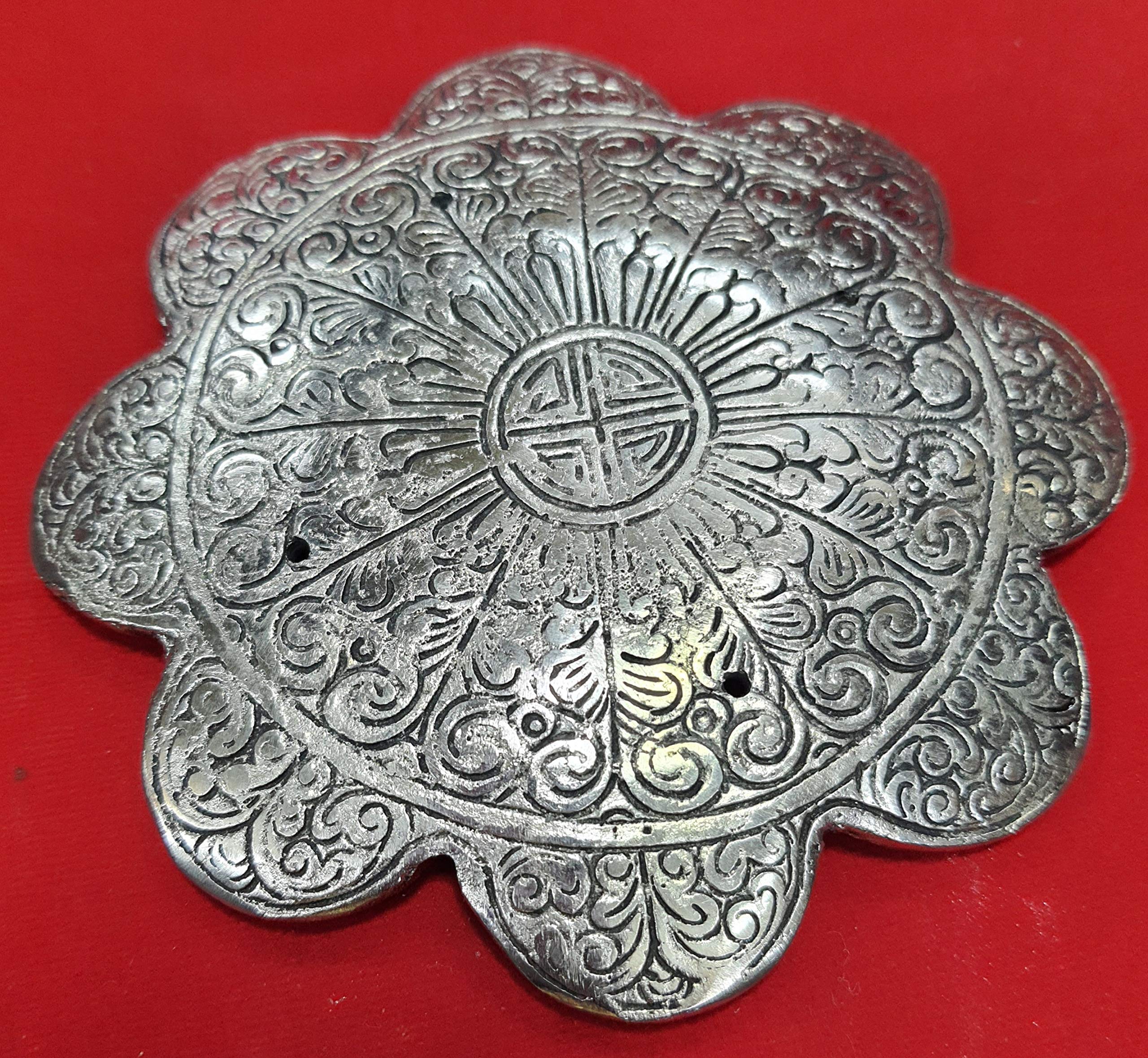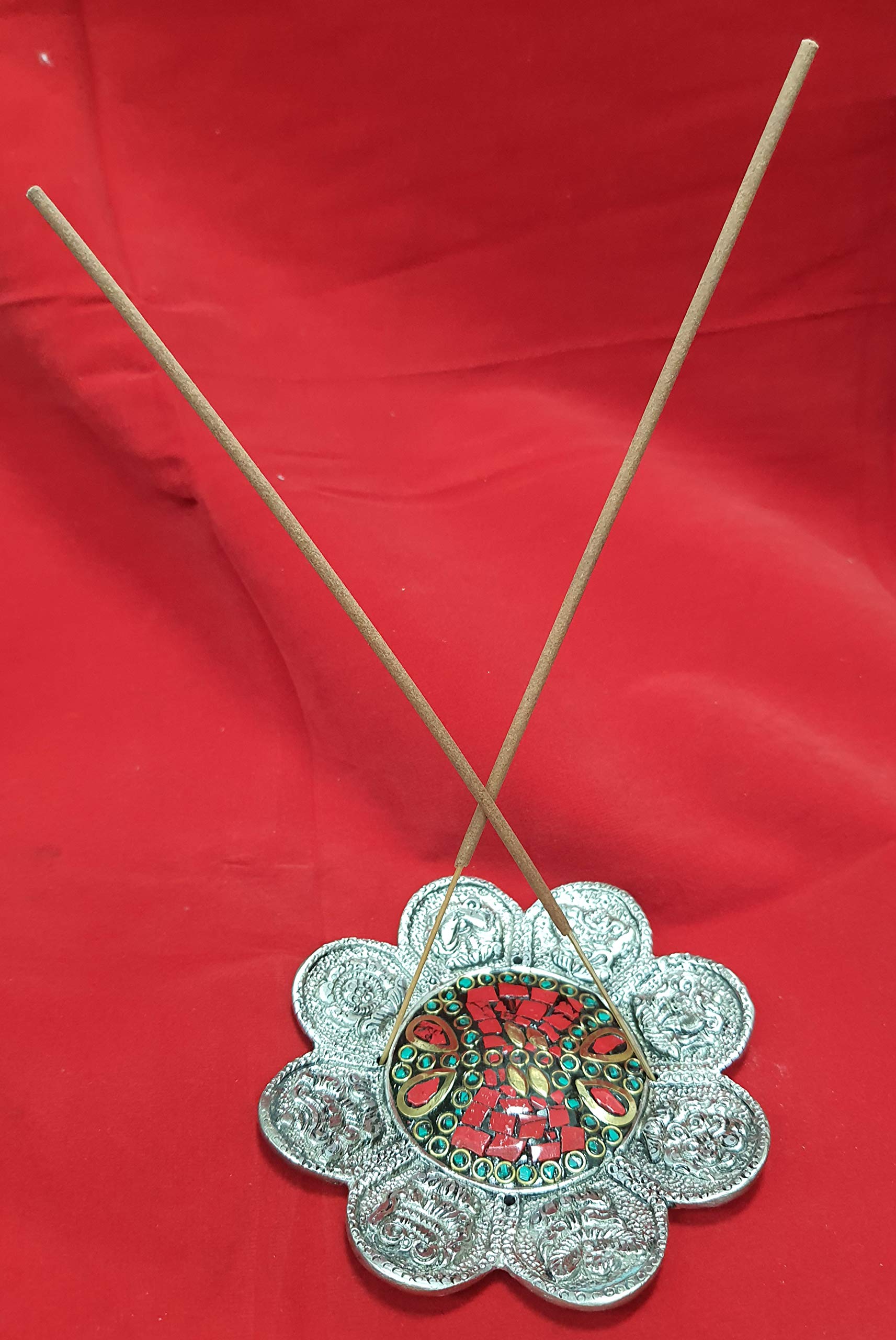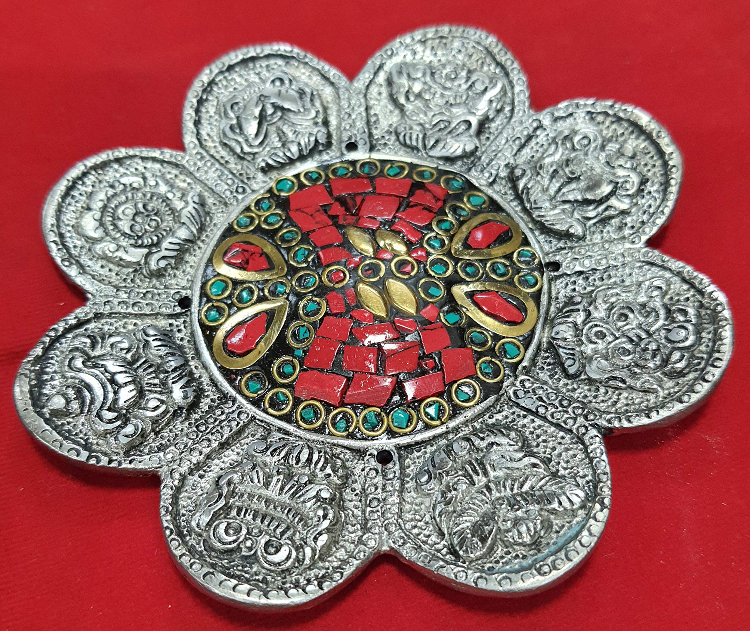Aluminium silver platted flower shape tibetan buddhist incense stick holder with 8 auspicious lucky sign decorated with stone and brass chips very well and fine handcrafted product