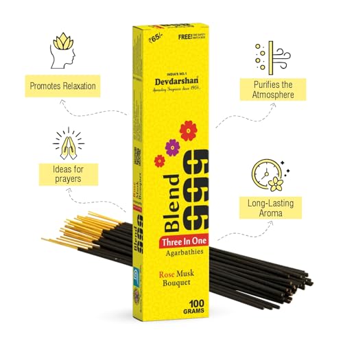 Devdarshan Black 999 Agarbathies is a Three in One combination pack of rich fragrances in Rose Musk & Bouquet 115g Agarbathies in each unit. Usage of the Incense sticks - For meditation or spiritual purpose. - Creates an aura that your prayer reaches the divine and is completed. - Healing power that has a soothing effect on the mind. Why Choose us? Since 1954 Devdarshan believed âQuality is Highest Priorityâ. We are manufacturing premium quality Dhoop Agarbatti Hawan Samagri Dry Dhoop Cones Chandan Dhoop Sticks & Sambrani Dhoop Cup Cones. The very name is an evidence for our popularity among the masses. Being at the culmination we have not only ruled out the markets nationwide but also abroad. We put forth every gesture just to serve the pious need of the masses to pray to the Almighty. Our Incense sticks are made from bamboo sticks and charcoal. They are made by creating the best mixture of essential oils barks flowers resins and they are worked into a tar like roll or they are just blended together. The combination of all these creates an amazing and pleasant aromatic smell offering you the best experience for all your purposes.
