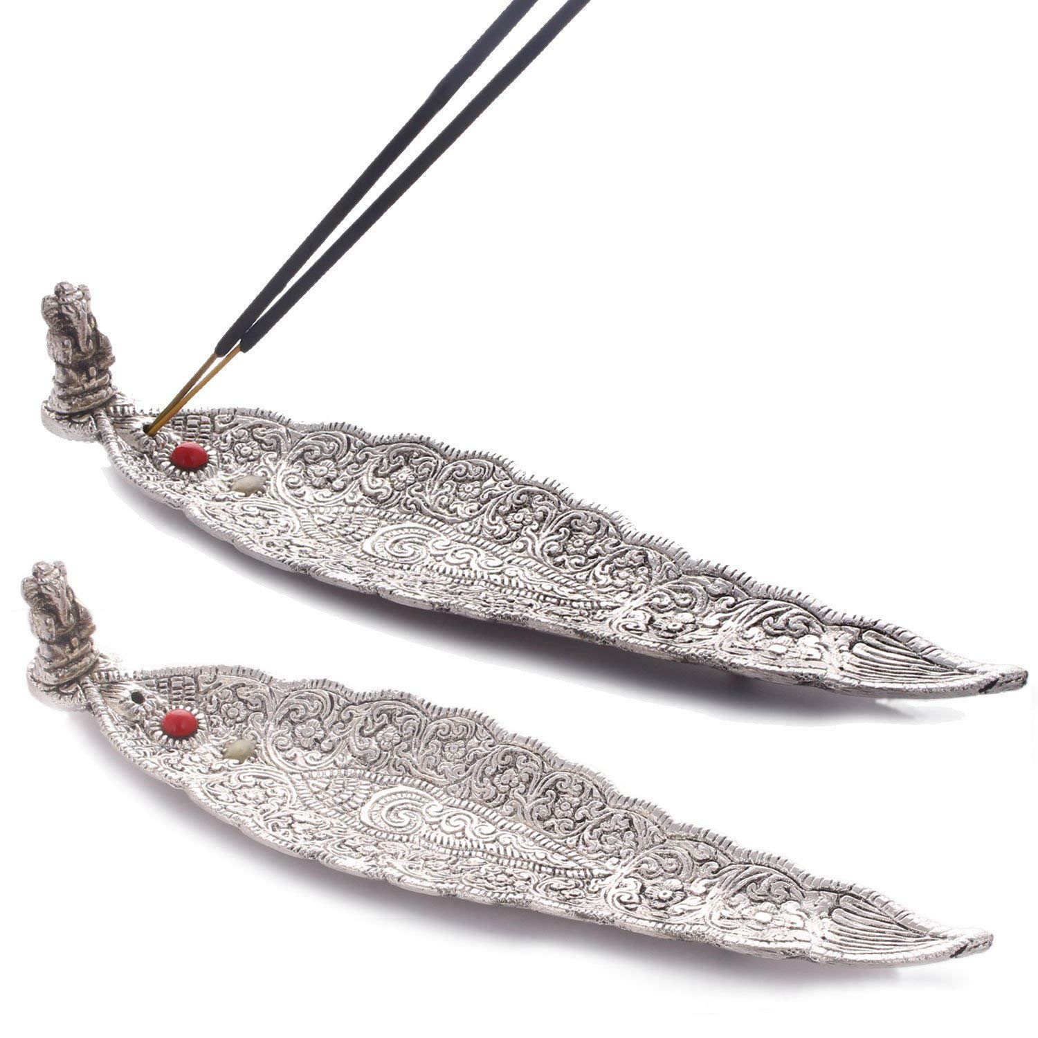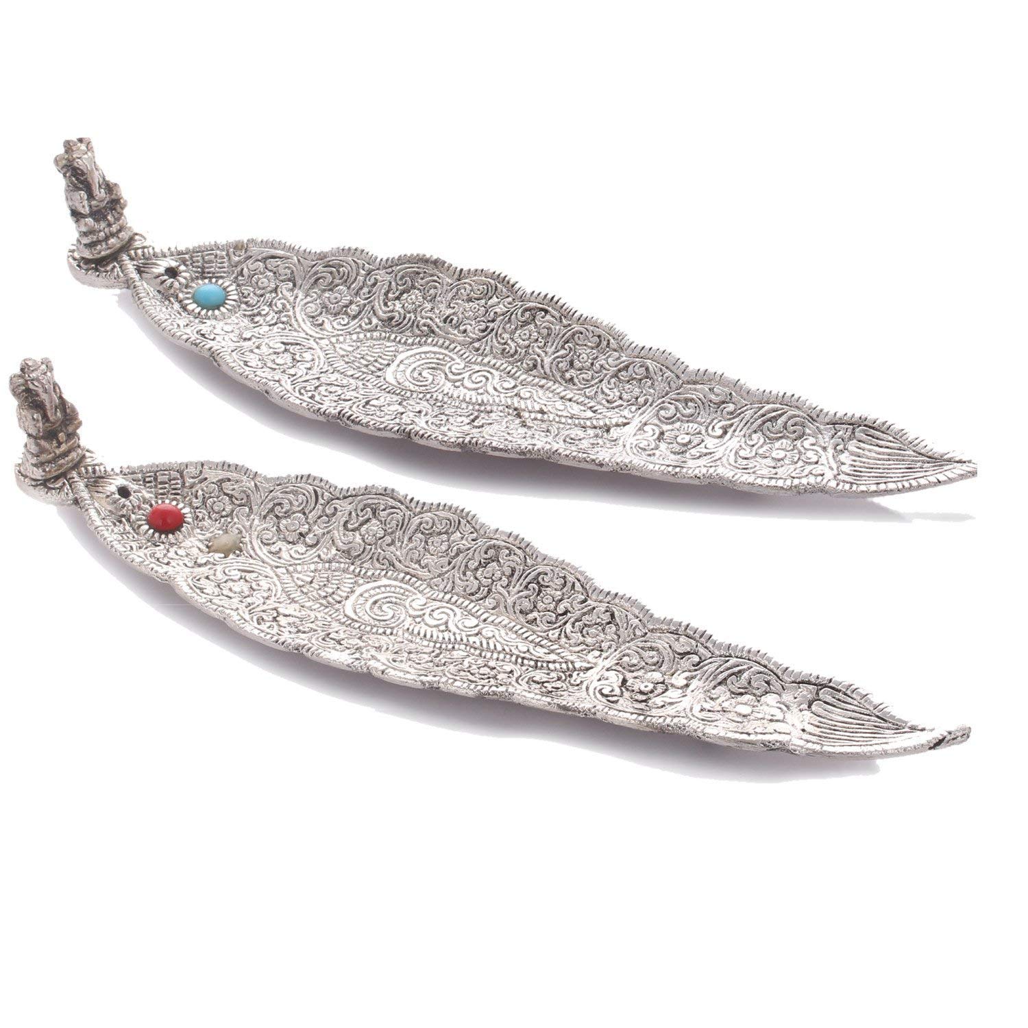 CHURU SANDALWOOD CARVED Aluminum Incense Holder & Ash Catcher Agarbatti Stand Set fo 2 Featuring Ganesh Figurine (9x2 inch Silver) Medium