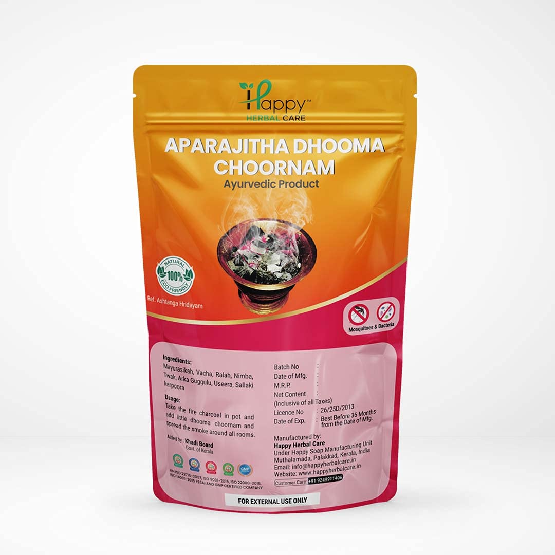 Aparachita dhoopa churna is a mixture of dry herbal powder used for fumigating the room. It has good antimicrobial properties prevents spreading of infection cleans the atmosphere. The fumigation with Aparajitha Dhooma choornam prevents the spread of infectious fever and also disinfects the air from pathogens.