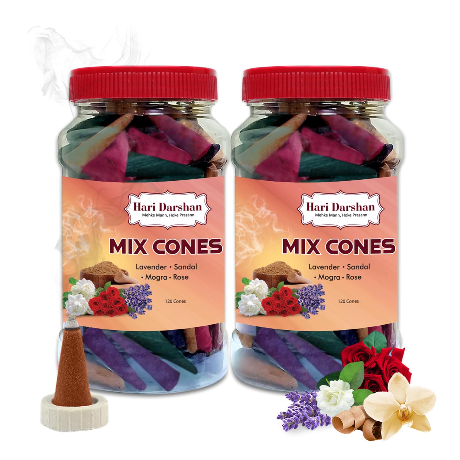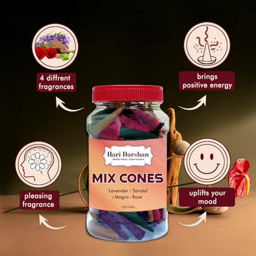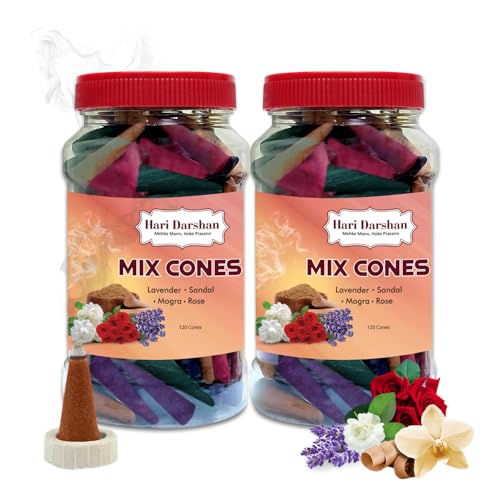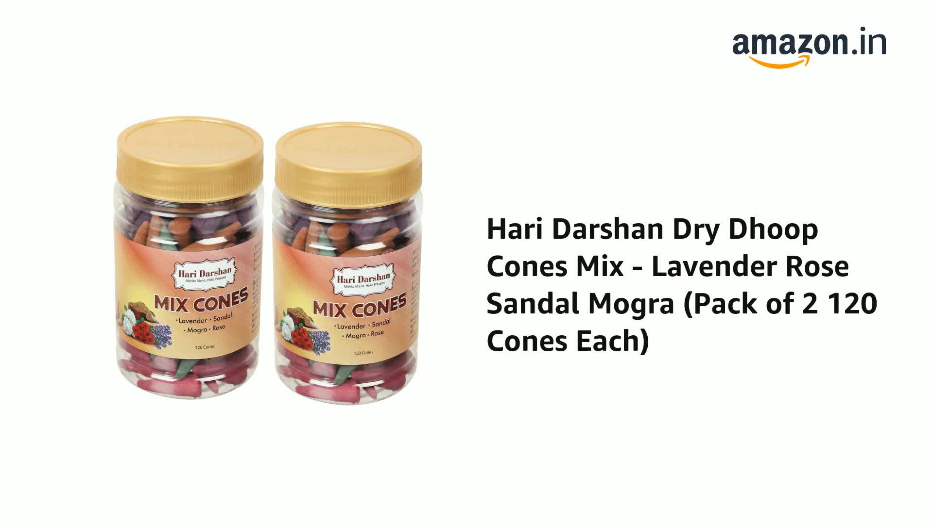 Hari Darshan Mix Jar cone is an assortment of heavenly fragrance of Lavender Rose Mogra Sandal that can be used for praying meditation or for relaxing. These pleasing aromas will lift your mood in moments and create a mesmerizing atmosphere. Hari Darshan ambience. These cones can be used for Praying Meditation or Lavender cones have a delicate fresh aroma that creates a pleasing atmosphere and calms the mind. It also helps to sleep peacefully. Hari Darshan Rose cones bring the heavenly enchanting and lingering fragrance of fresh Roses. It not only uplifts the ambience of the room but also cheers you up. Hari Darshan Mogra cones have fresh floral fragrance for creating a divine for Relaxing ambience Hari Darshan Sandal cones are known for their mesmerizing aroma that is ideal for prayers and meditation. Hari Darshan Dhoop Cones Ideal for creating a calming atmosphere at home or the office Perfect for pujas aroma therapy and meditation. Dhoop Cones fills the environment with positive energy to make your living space and even work space aromatically Blissful.