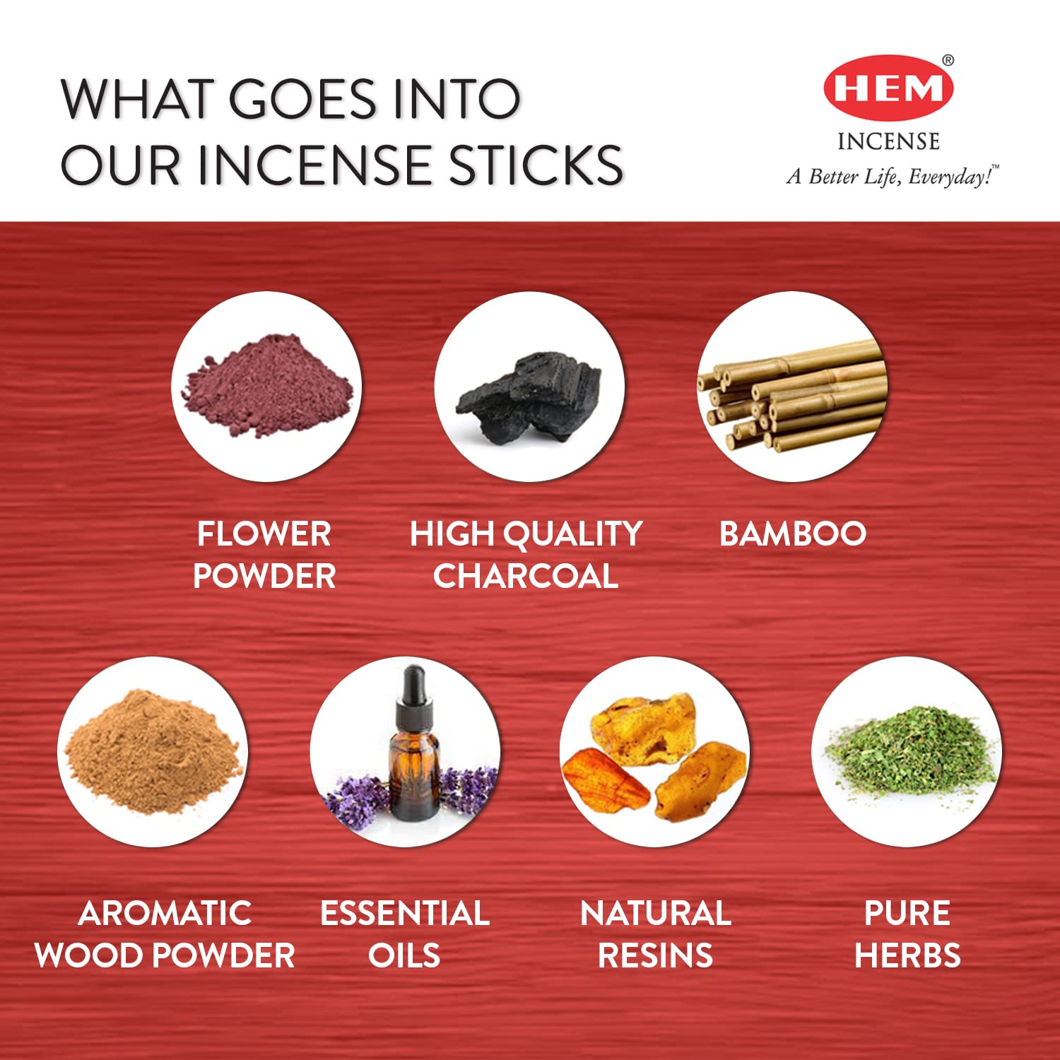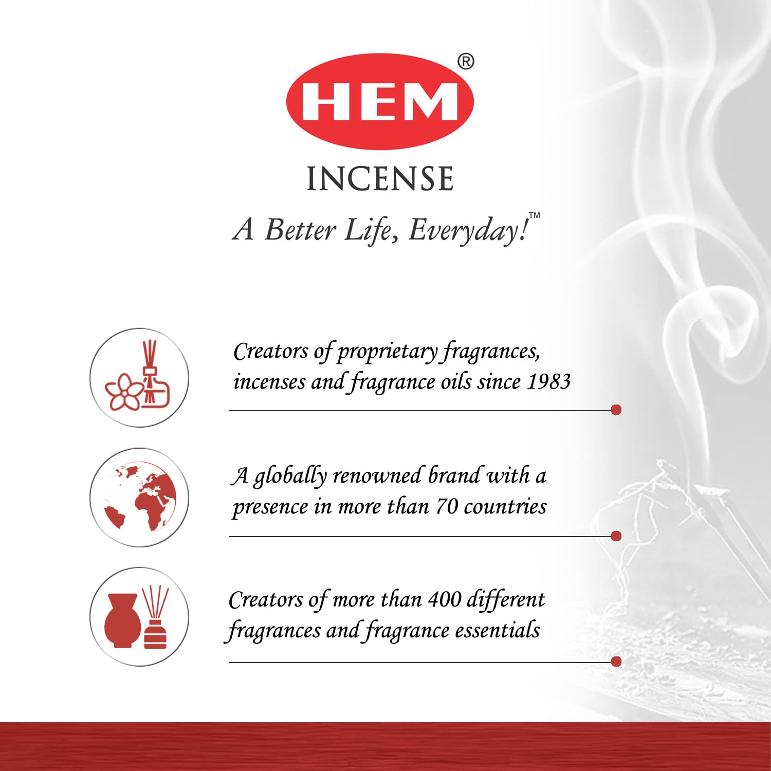 Usage of the Incense sticks - For spiritual or meditational purpose - Used for conveying prayers to god every morning - For creating inviting and refreshing auraWhy Choose us? Over a period of 35 years HEM has pioneered the art of incense making. We manufacture a wide range of incense products for our consumers. Our Incense sticks are made from bamboo sticks and charcoal. They are made by creating the best mixture of essential oils barks flowers resins and they are worked into a tar like roll or they are just blended together. The combination of all these creates an amazing and pleasant aromatic smell offering you the best experience for all your purposes.