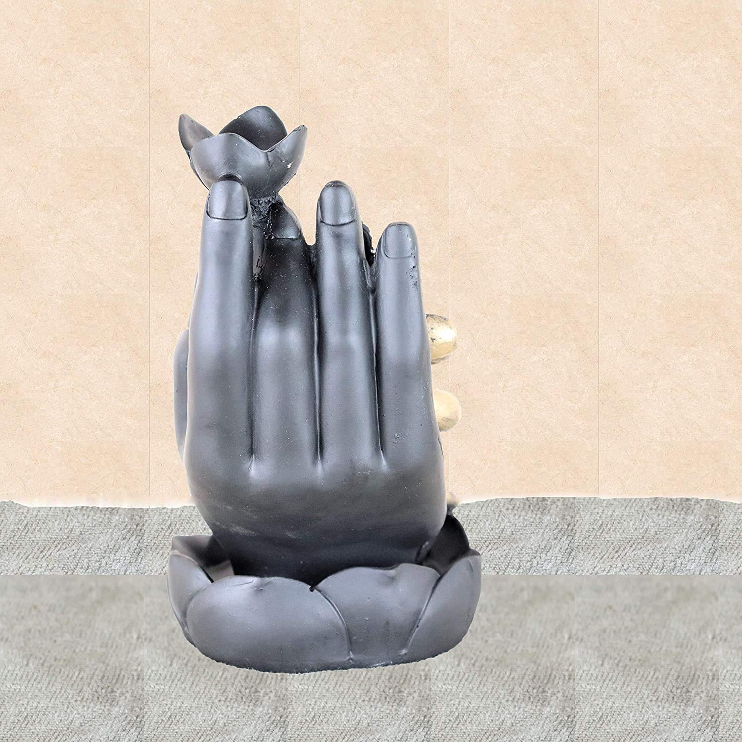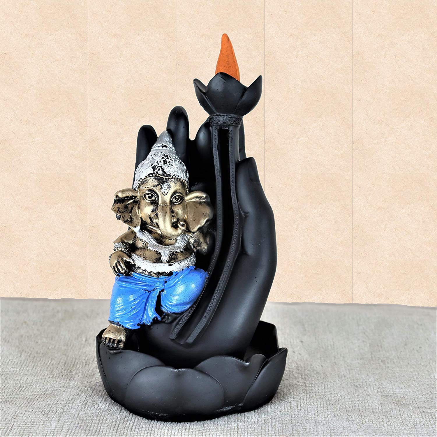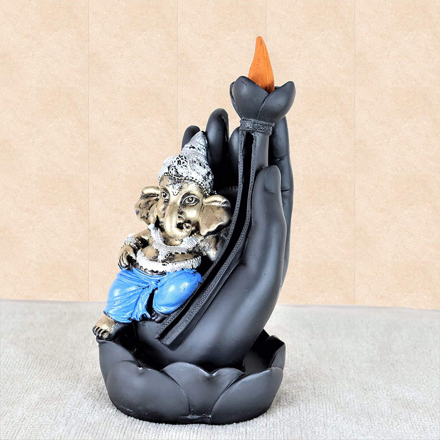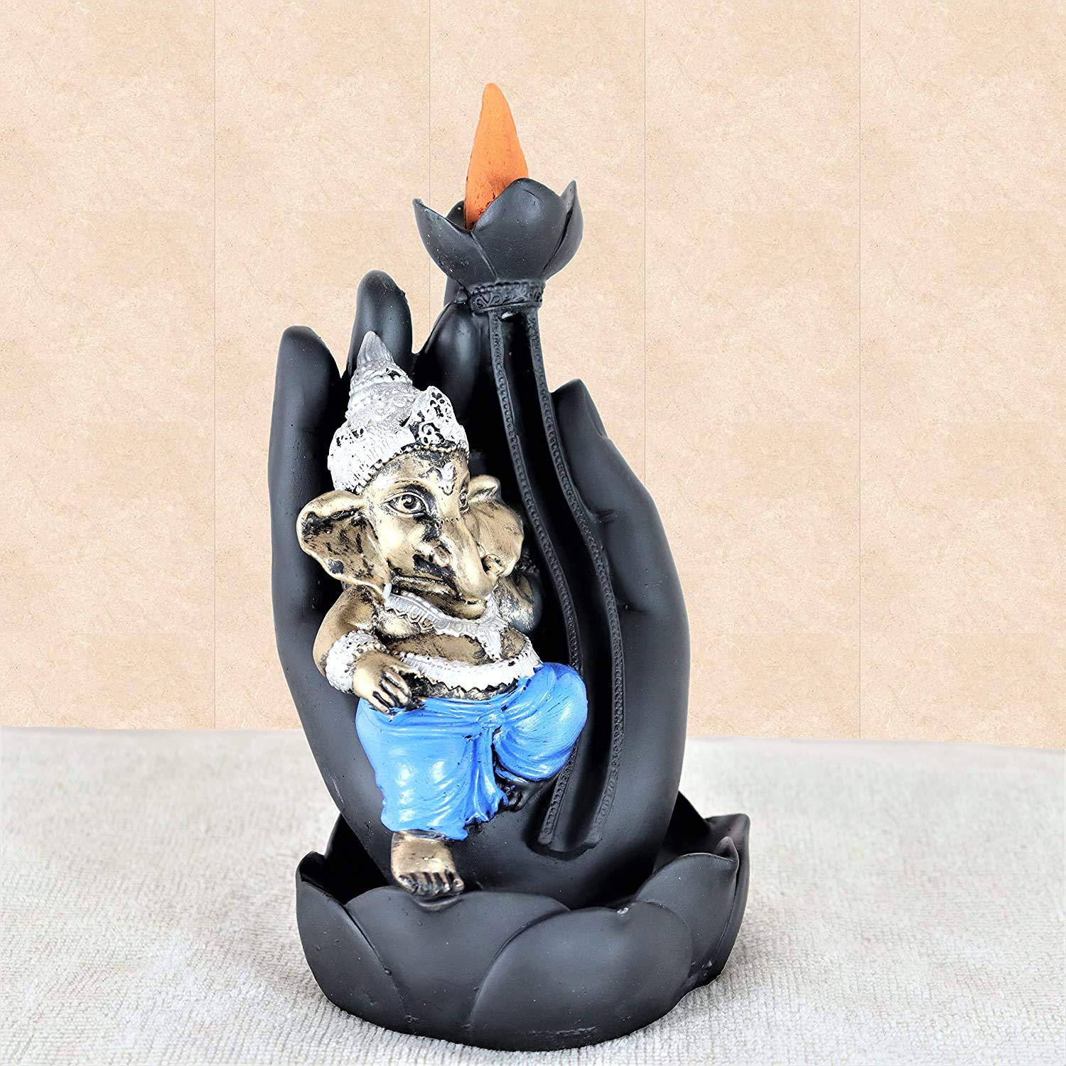 MEENAKARI ENAMEL PRODUCTS Polyresin Ganesha Sitting on Palm Smoke Backflow Cone Incense Holder with 20 Free Smoke Backflow Scented Cone Incenses (Blue)