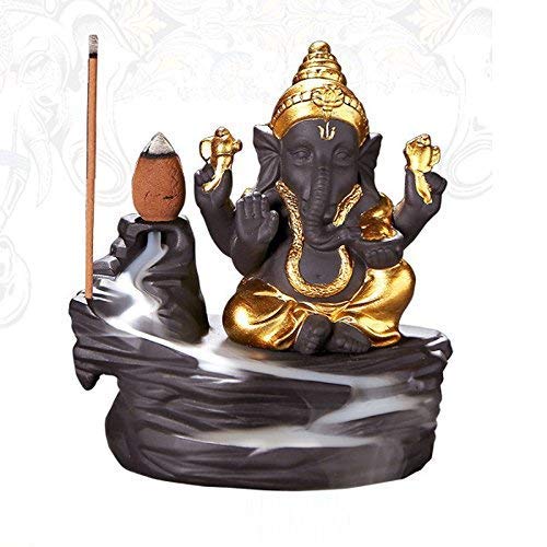 MEENAKARI ENAMEL PRODUCTS PolyResin Ganesha Smoke Fountain Backflow Waterfall Cone Incense Holder Showpiece Statue with 10 Back Flow Incense Cones (Golden)