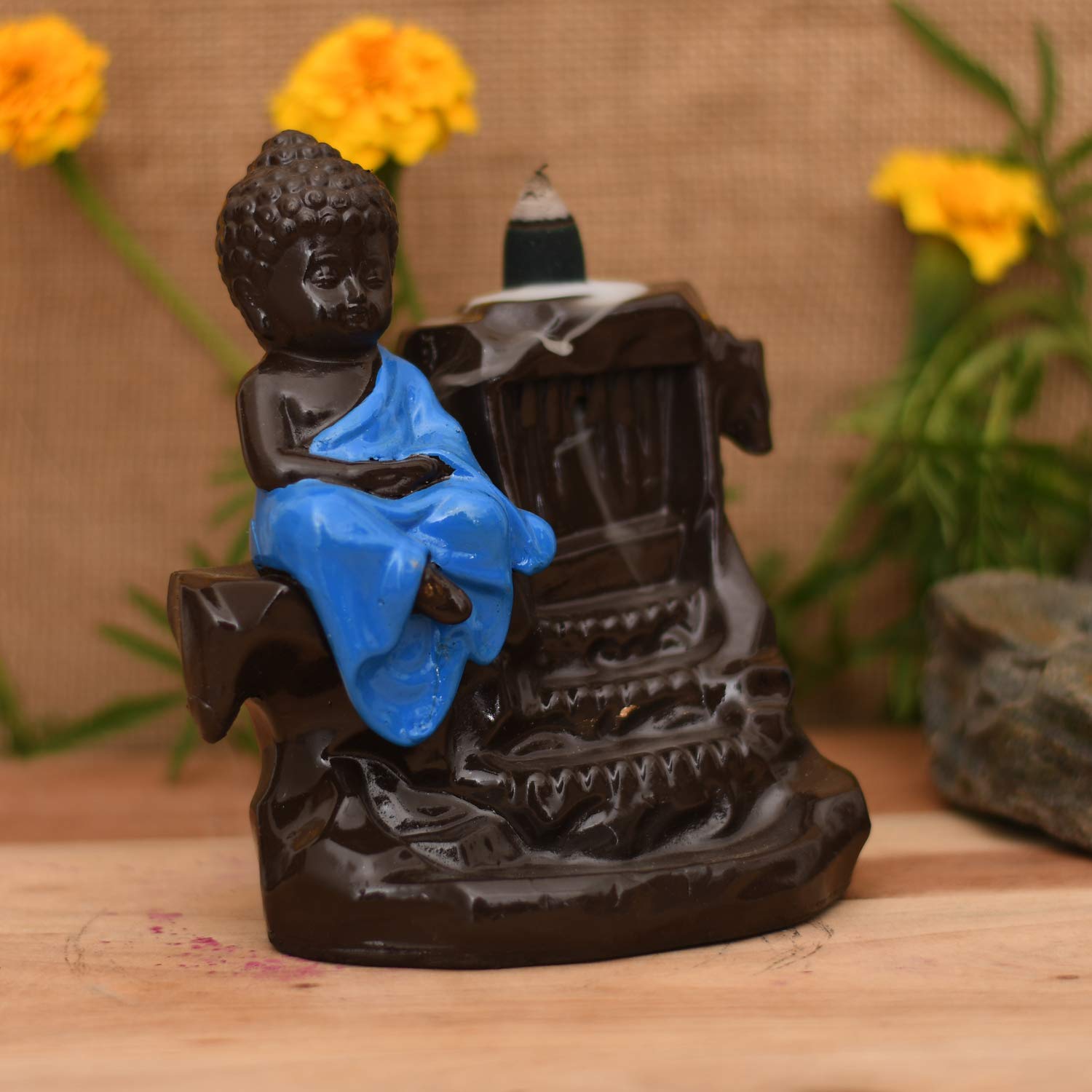 MEENAKARI ENAMEL PRODUCTS Polyresin Meditating Monk Big Buddha Cone Incense Holder with 10 Free Smoke Backflow Scented Cone Incenses (Blue)
