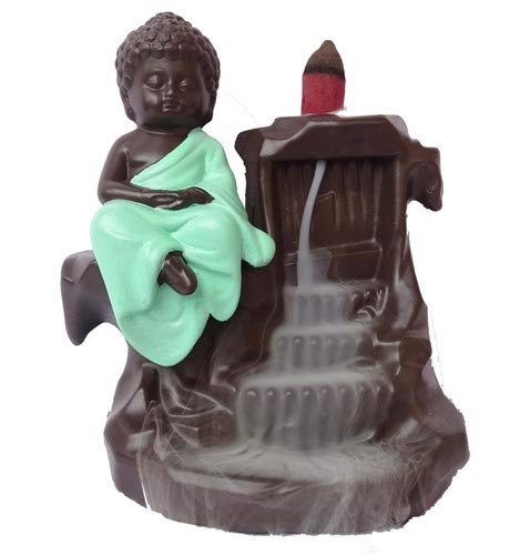 MEENAKARI ENAMEL PRODUCTS Polyresin Meditating Monk Big Buddha Incense Holder with 10 Free Smoke Backflow Scented Cone Incenses (Green) 10x8x13 cm
