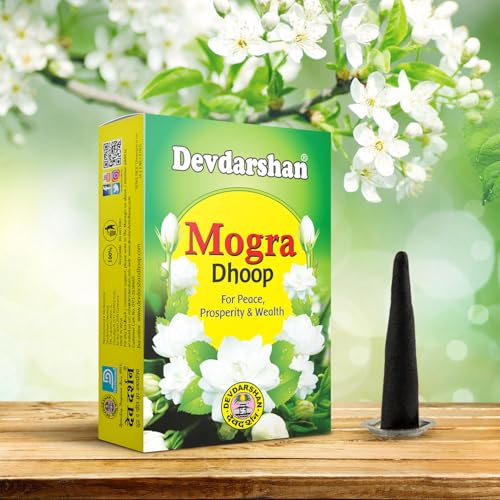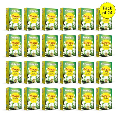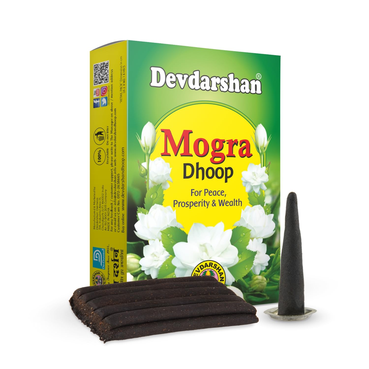 Transform your home into an enchanted sanctuary of peace and spirituality with Devdarshan Mogra Dhoop. The sweet Jasminum Sambac (Mogra) fragrance will gently float its way throughout your home instantly lifting the mood and creating a kind and inviting atmosphere. SAFETY INSTRUCTION: Always Keep burning dhoop / Incense sticks on dhoop / Incense stand / holder make sure you keep away from flammable articles ashes should always fall on fire proof or heat resistant surface.
