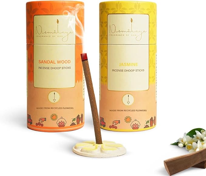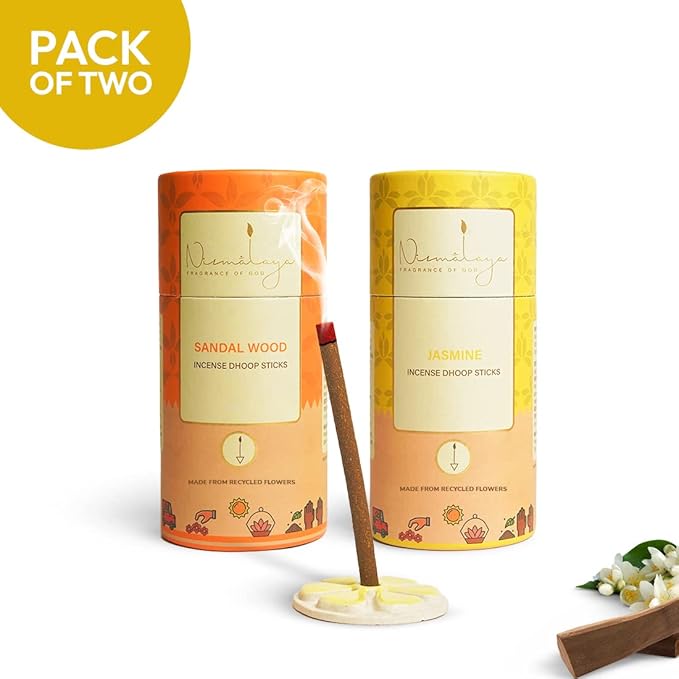 The perfect addition to your daily routine for a peaceful and calming experience, Sandalwood & Jasmine dhoop sticks for pooja are made from recycled flowers and dipped in pure essential oils to help you have a peaceful atmosphere. Releases a sweet floral aroma that relieves both body and mind. Dhup for puja Purifies the air and infuses the room with a pleasant fragrance.