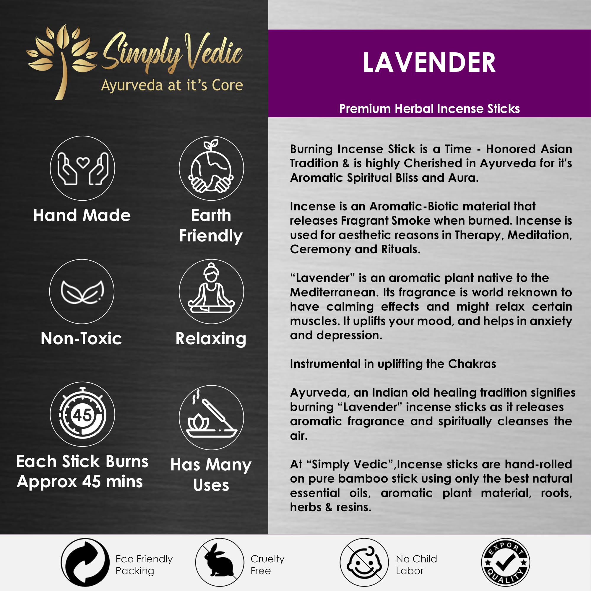 Simply Natural: Simply Vedic Premium Lavender Incense Sticks are 100% Natural NO-CHARCOAL & NO-CHEMICALS. We select only the best of Earth Derived wooden sticks Flowers Aromatic herbs Pure ESSENTIAL OILS and Exotic Spices to create a range of mystical sce