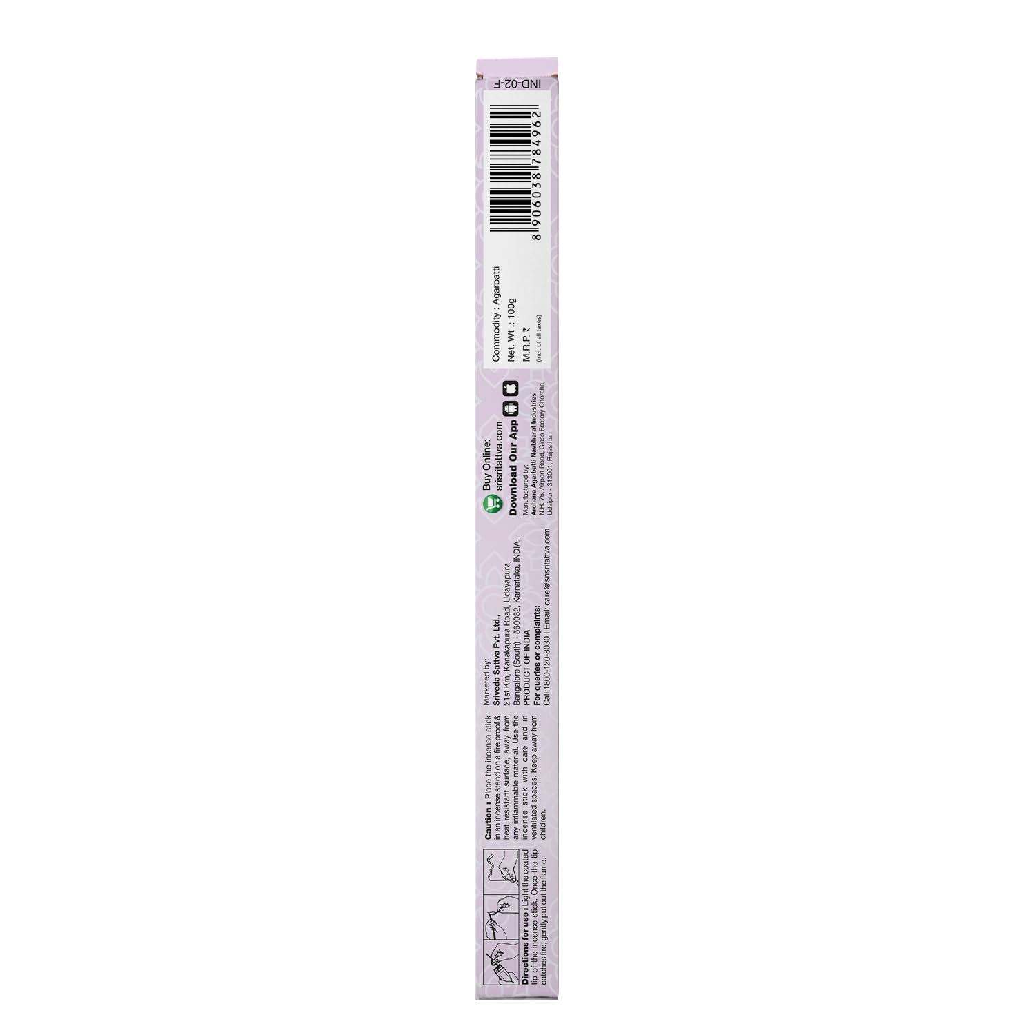 Directions for use: Light the coated tip of the incense stick. Once the tip catches fire gently put out the flame. Caution: Place the incense stick in an incense stand on a fire proof & heat resistant surface away from any inflammable material. Use the incense stick with care and in ventilated spaces. Keep away from children.