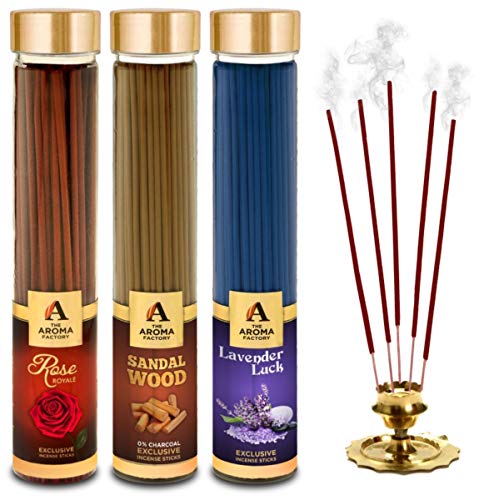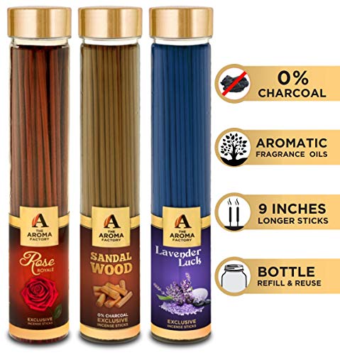 The Aroma Factory Rose Royal Sandalwood Chandan & Lavender Incense Stick Agarbatti (Zero Charcoal & 100% Herbal) Bottle Pack of 3 x 100with an invigorating and refreshing fragrance.