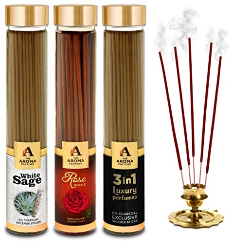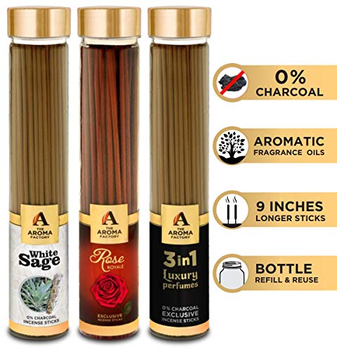 HomeHomeSpiritualIncense SticksThe Aroma Factory White Sage Rose Royal & 3 in 1 Incense Stick Agarbatti (Zero Charcoal & 100% Herbal) Bottle Pack of 3 x 100