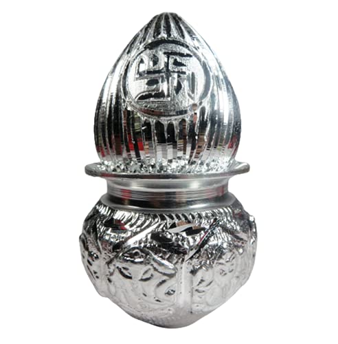 WOOD CARVING WORK beautiful German silver- finish riddhi siddhi KALASH (purna kumbha) with COCONUT worshipped at Hindu ceremonies like Griha Pravesha (house warming) child birth child naming havan (fire-sacrifice) Vaastu dosha rectification and daily worship. Used for wealth and prosperity home and office decoration gift purposes used in temples pooja ghar and shops