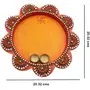 Offer prayers in style with this majestic Multicolor floral pooja thali. A embellished blue border adds to its grace whereas a orange color in the center makes it auspicious. Complemented a roli-tikka container it will surely make celebrations memorable. Expert workmanship on this pooja plate awards it a dazzling look with pink and orange enamelwork. For its incredible appeal it serves as an ideal gift for your loved ones family and friends. This pooja thali is diligently handcrafted by skilled artisans from the house of JaipurCrafts using various traditional techniques.