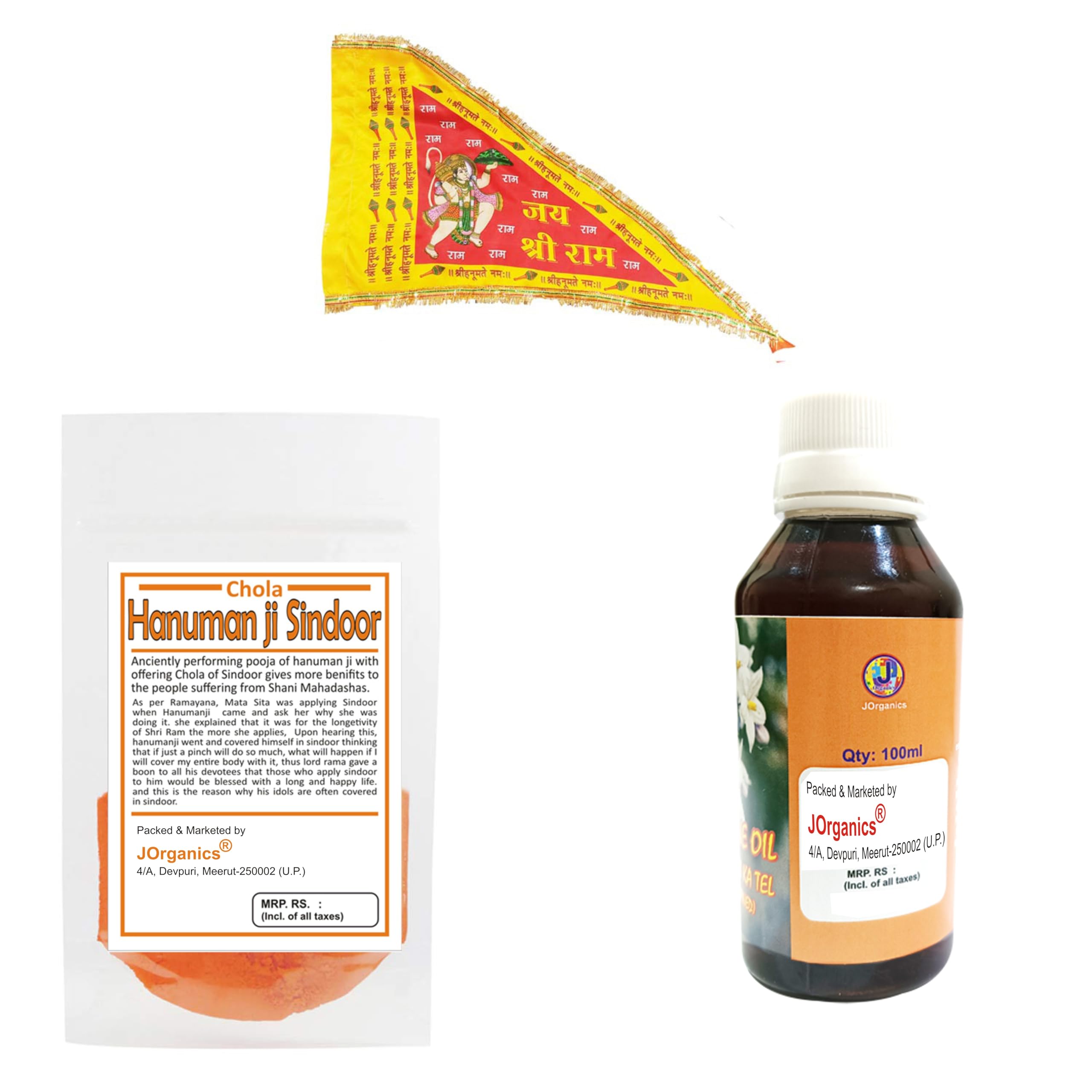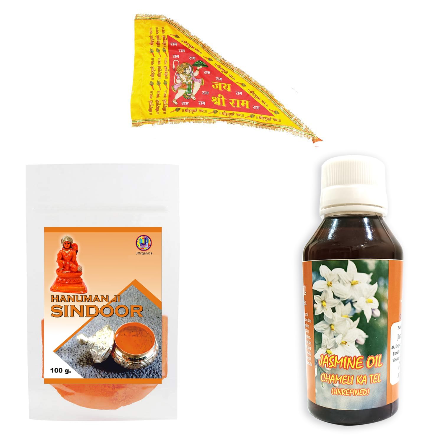 Enhance your spiritual practices with this comprehensive Hindu worship set. The package includes a 100g container of Hanuman Ji Sindoor traditional Jasmine Oil (Chameli Ka Tel) and a vibrant Jai Shri Ram flag. The premium-quality sindoor presented in a convenient 100g package is perfect for religious ceremonies and daily worship. The pure Jasmine Oil also known as Chameli Ka Tel offers a divine fragrance that creates a serene atmosphere during prayers and meditation. The beautifully designed Jai Shri Ram flag featuring red and yellow colours with sacred text adds an auspicious touch to your prayer space. This carefully curated set combines essential items for devotional practices making it ideal for home temples and religious occasions. The set comes in proper packaging to maintain the purity and quality of each item. Perfect for daily puja rituals or as an offering during festivals and special ceremonies.