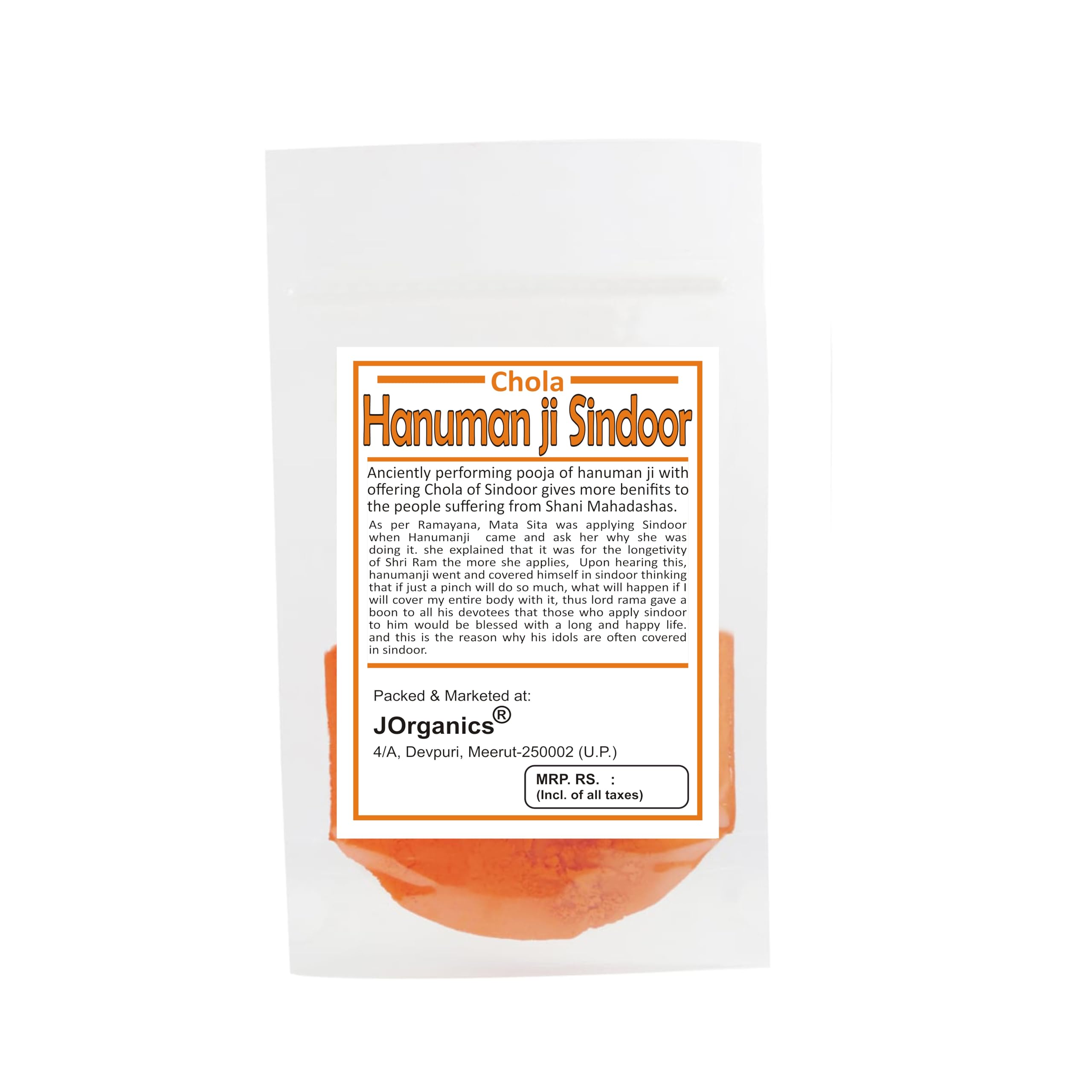 Orange Hanuman ji sindoor used for Hanuman chola.Hanuman ji Sindoor is the purest form of sindoor extracted from the flowers of sindurThe orange coloured powder extracted from this flower is mixed with mercury to form the best quality of sindur used in religious activities..This sindoor is mainly used in worshipping Lord Hanuman Ji and Lord Ganpati..We see in almost all Hanuman temples that the deity of Hanuman sindoor is covered or coated with orange colour sindur..Best for pooja ritual purposes.We are blessed by Bajrangbali to announce that our sindoor is offered at Siddh Peetha of Bajrangbali in different parts of India. *24x7 service available