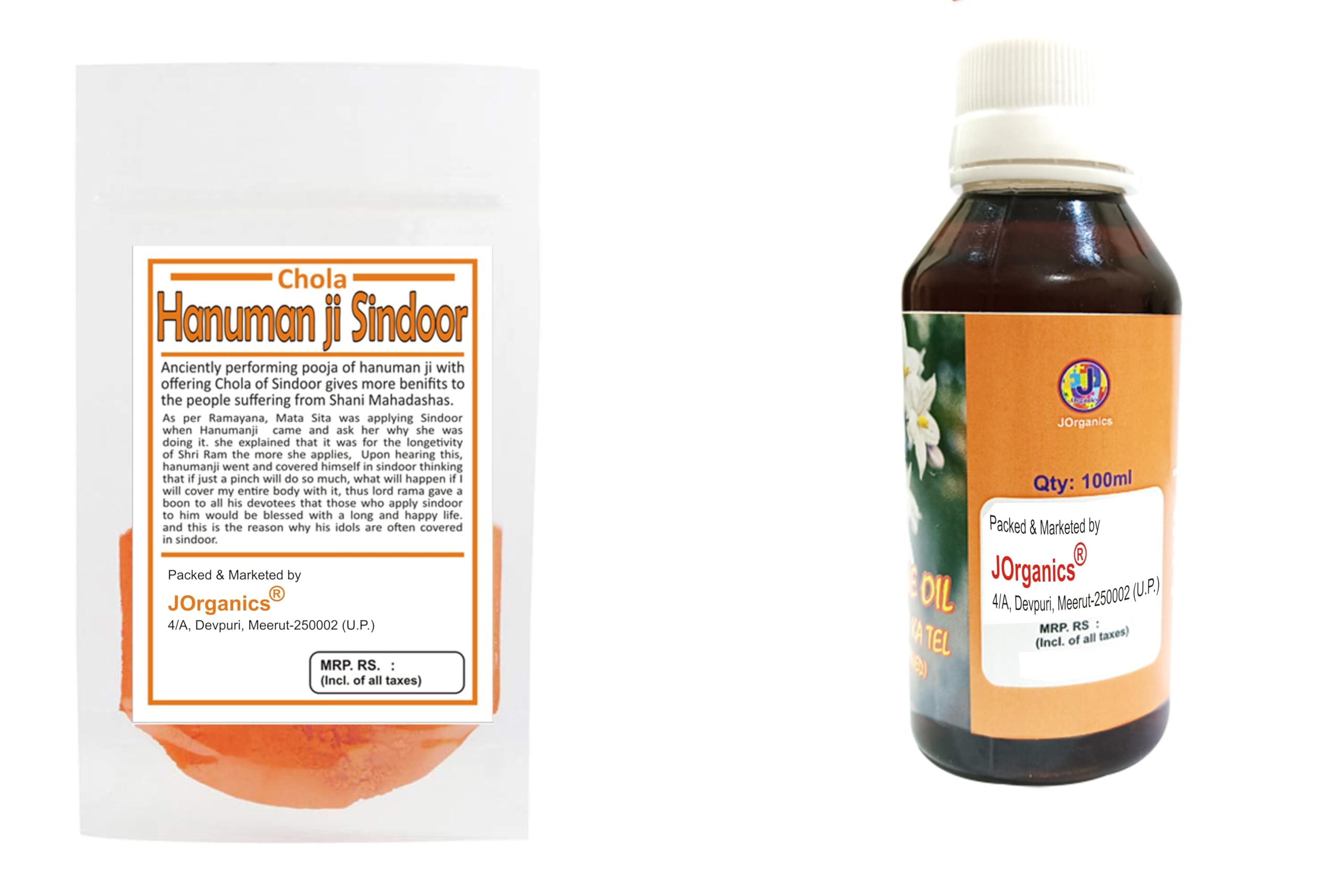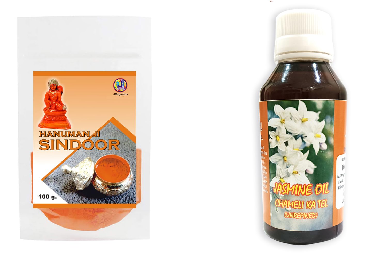 Discover the sacred blend of tradition and aromatherapy with JOrganics Hanuman Ji Sindoor and Jasmine Oil set. This thoughtfully curated package includes 100 grams of vibrant sindoor powder paired with 100ml of pure unrefined jasmine oil (Chameli ka tel). The sindoor powder maintains its traditional significance whilst being enhanced by the calming natural fragrance of jasmine. The set comes in convenient packaging - the sindoor in a practical powder form and the jasmine oil in an easy-dispensing bottle. Perfect for religious ceremonies and daily worship rituals this combination offers both spiritual significance and sensory pleasure. The jasmine oil adds a moisturising element to the application process making it gentle on the skin while maintaining the sindoor's characteristic orange-red hue. The aromatic jasmine oil provides a soothing floral fragrance that elevates your devotional experience. This dual-component set is ideal for devotees and religious practitioners who value both tradition and quality in their spiritual implements. Store in a cool dry place to preserve its authenticity and efficacy.