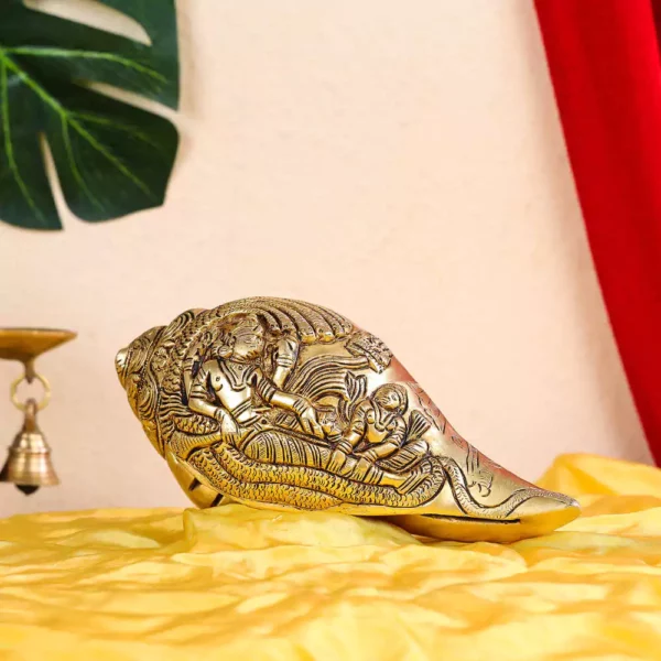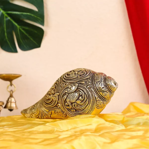 Decorative Asset: Apart from its religious significance the Brass Shankh serves as a decorative asset adding cultural charm and elegance to any space. It can be displayed on shelves mantels or as a centerpiece in a sacred corner.