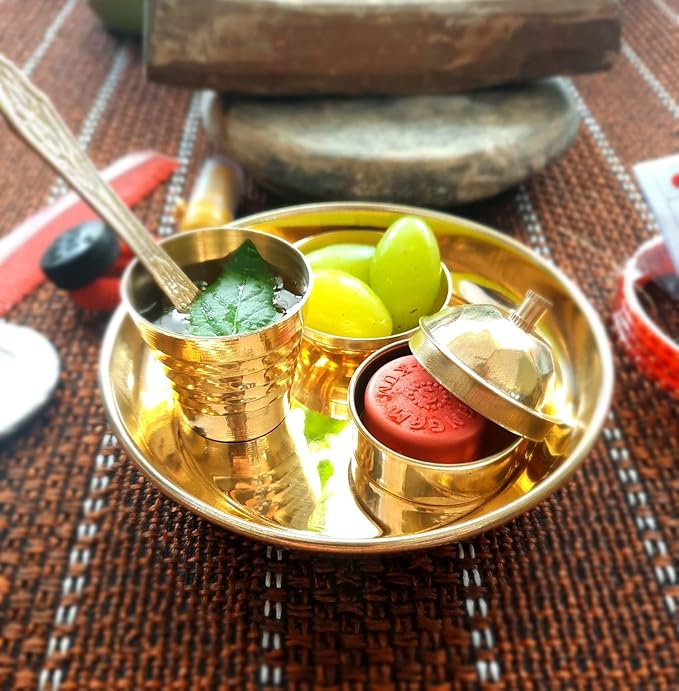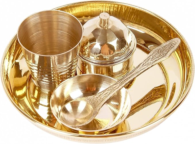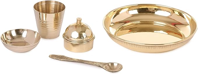 Package contains - 1 small brass plate, 1 small glass(glassia), 1 small bowl (katori), 1 small spoon, 1 vermilion box(sindoor/roli dibbi)