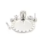 Dynore Pooja Thali Set in Silver Plated consists of an intricately designed Pooja plate as well as an assortment of their items necessary for performing various religious rites during auspicious occasions Beautifully polished and crafted this 7 pcs Pooja Thali Perfect for worship place as well as special occasions/festivities Present on The Occasion Of Diwali Raksha Bandhan & Other Festive Season. Also Use As A Best Wedding Return Gifts This set contains Plate Bell Diya Agarbatti Stand Spoon Small Wati Small Lota Product Dimension- Thali- 24x24x1.5 cm Small Lota- 6x6x6.5 cm Diya- 5x5x3 cm Bell- 7.5 cm long Agarbatti Stand- 5.5x5.5x2.5 cm Spoon- 13.5 cm Long Small Wati- 4x4x1.5 cm Pooja is the key that unlocks all the storehouses of god's infinite gravce and power This set is purely coated with Silver