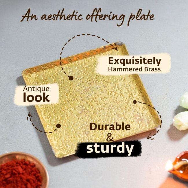 A well-crafted brass base in the form of a unique square plate, made to hold the Devi Gudi in all her glory. Humbly hammered, to give it an antique look, this plate can also be used to make your offerings to Devi.Pushpam, to enthrall her, Kumkum and Haridram, to adorn her.Shreephalam, to offer her one of the most pious fruits.Prasadam, to add more sweetness to your devotion.Place them all at once at her feet and make your simple offerings special.