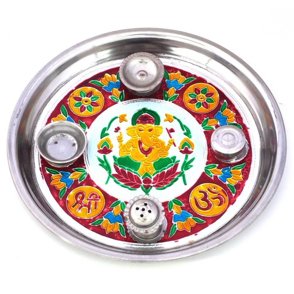 Now wish your family and friends that god may fulfill all their wishes in wealth health and happiness in their life with this very ethnic and enticingly crafted pooja thali which has the ganpati image in the middle to make your wish come true. This shubh laabh pooja thali is made of steel. It is decorated with meenakari work which gives it rich look.