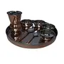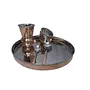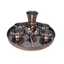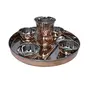This is a dinnerware thali plate set consists of 1 plate (Thali) 4 bowls 1 tumbler 1 dessert spoon 1 fork and 1 knife. In India most of their dishes are served simultaneously in a thali. A thali is a round platter with an eared rim. Entire meals can be served using this simple plate. The thali is generally made with steel or copper. Other dishes served on a thali include vegetables yogurt chutney and pickles. In restaurants vegetarian or meat-based thalis can be served. Thali is delightful ways to enjoy Indian cuisine. It serves a balanced meal in itself and the flavors are so well rounded that palates will certainly be satisfied. Care Tips:- Clean your copperware by hand and avoid dishwasher as the detergent can cause oxidation leading to permanent damage. Use a solution of equal quantities vinegar or lemon juice and salt diluted with some water at such times but don't use it regularly. Also avoid scratchy cleaners like steel wool. A simple soft cleaning liquid on soap base hot water and a soft washing cloth is best for daily use.