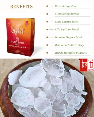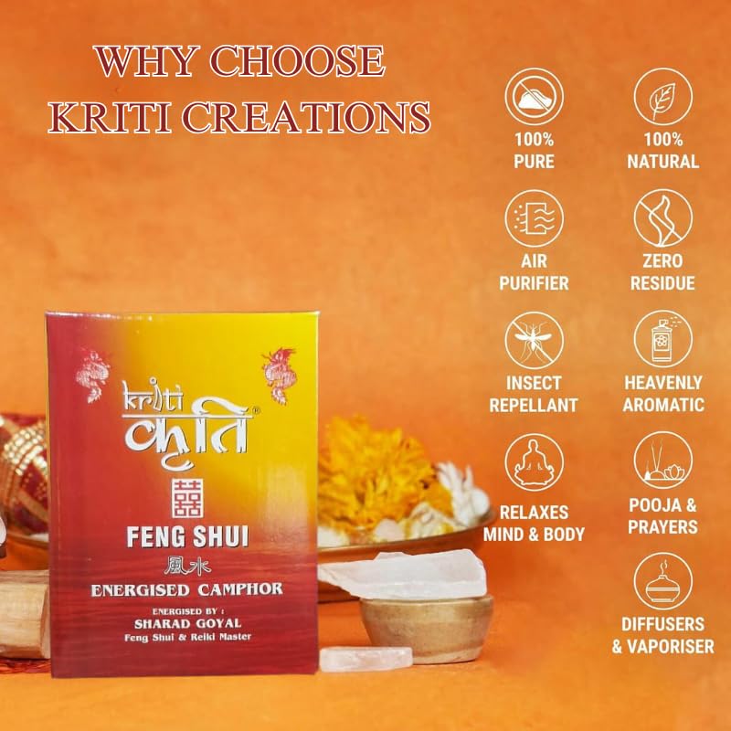 The Kriti Creations Feng Shui Energised Camphor is a high-quality camphor that is specially energized with Feng Shui principles. It comes in a 250gms pack ensuring that you have an ample supply for your spiritual and healing needs. It removes negative energies ill health creating energies and purifies the environment. Where there is lot of negative depression/stress energy in the atmosphere the special design of the device captures and burns it. When there is a major accumulation of negative mental-emotional energies the odour of the evaporating camphor is significantly reduced or even absent. As the atmosphere cleans up a strong camphor smell returns.