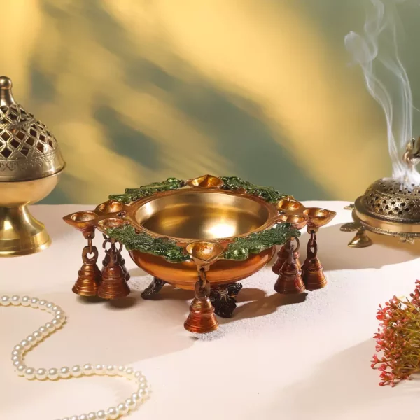 Stunning and Elegant Centerpiece: The Urli with Bells serves as a stunning and elegant centrepiece for your home. Its unique design complemented by the brass material adds a touch of opulence and sophistication to any space making it a focal point of admi